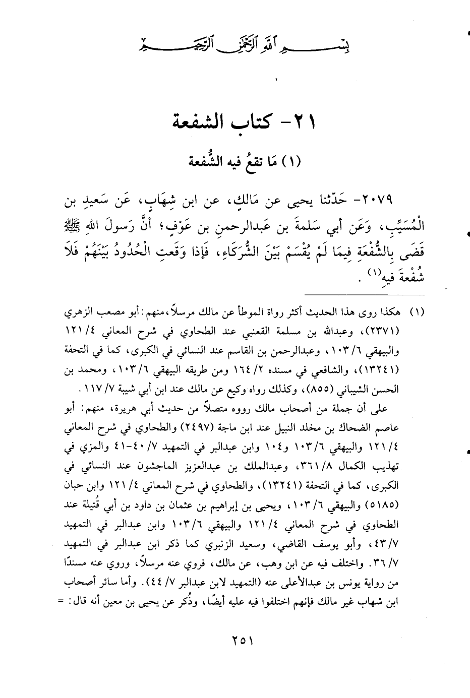 2079 - حَدَّثَنَا يَحْيَى، عَنْ مَالِكٍ، عنِ ابْنِ شِهَابٍ، عَنْ سَعِيدِ بْنِ الْمُسَيَّبِ، وَعَنْ أَبِي سَلَمَةَ بْنِ عَبْدِ الرَّحْمَنِ بْنِ عَوْفٍ، أَنَّ رَسُولَ اللهِ صَلى الله عَلَيهِ وَسَلمَ قَضَى بِالشُّفْعَةِ فِيمَا لَمْ يُقْسَمْ بَيْنَ الشُّرَكَاءِ، فَإِذَا وَقَعَتِ الْحُدُودُ بَيْنَهُمْ، فَلاَ شُفْعَةَ فِيهِ.
