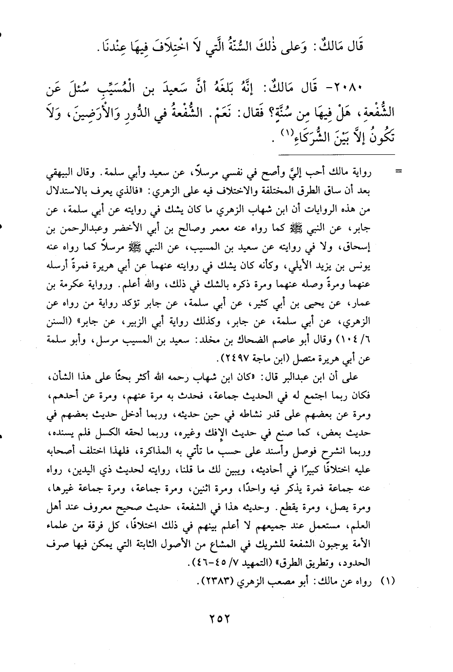 2080- قَالَ مَالِكٌ: إِنَّهُ بَلَغَهُ، أَنَّ سَعِيدَ بْنَ الْمُسَيَّبِ سُئِلَ عَنِ الشُّفْعَةِ هَلْ فِيهَا مِنْ سُنَّةٍ؟ فَقَالَ: نَعَمِ، الشُّفْعَةُ فِي الدُّورِ وَالأَرَضِينَ، وَلاَ تَكُونُ إِلاَّ بَيْنَ الشُّرَكَاءِ.