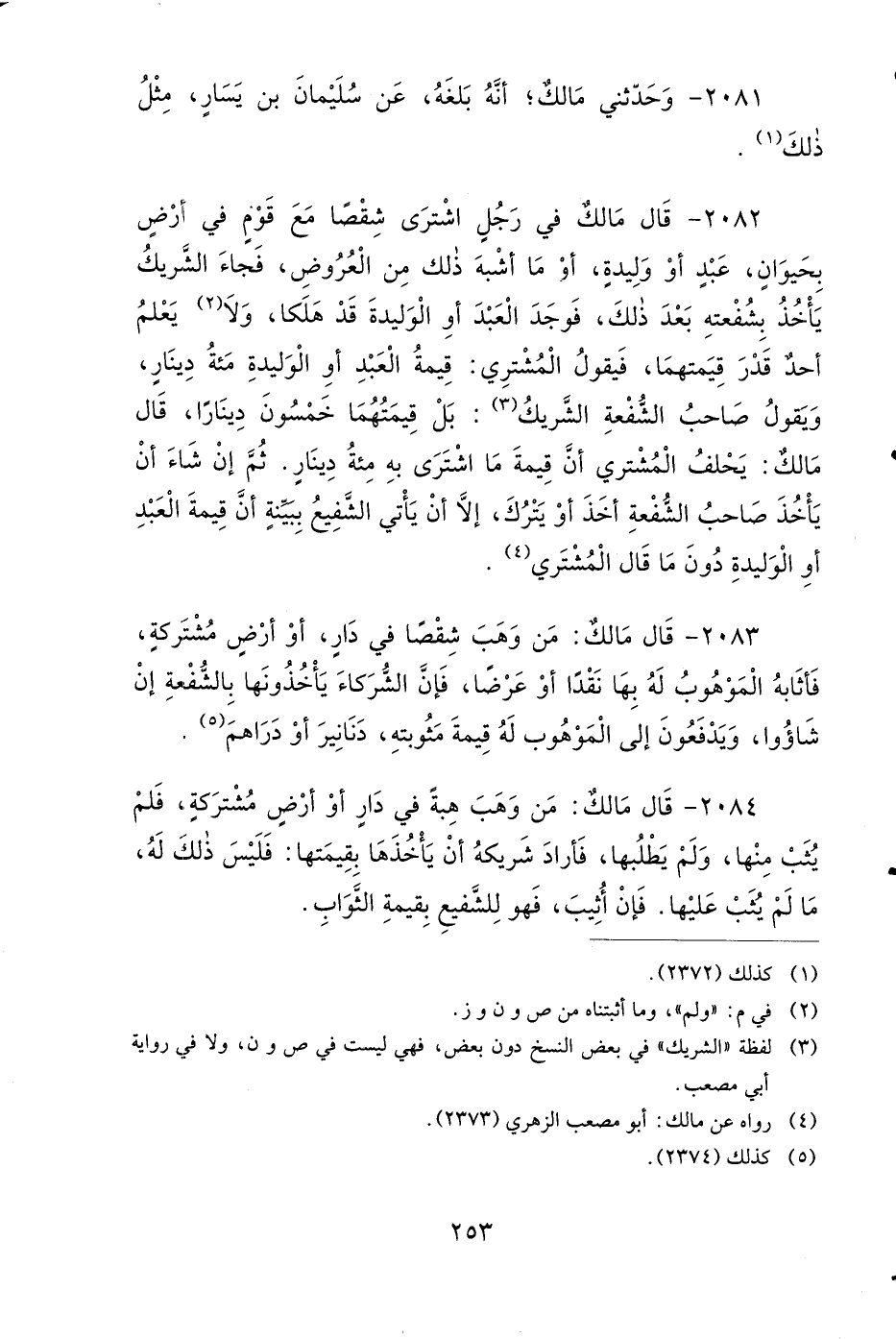 2082- قَالَ مَالِكٌ فِي رَجُلٍ اشْتَرَى شِقْصًا مَعَ قَوْمٍ فِي أَرْضٍ بِحَيَوَانٍ عَبْدٍ أَوْ وَلِيدَةٍ، أَوْ مَا أَشْبَهَ ذَلِكَ مِنَ الْعُرُوضِ، فَجَاءَ الشَّرِيكُ يَأْخُذُ بِشُفْعَتِهِ بَعْدَ ذَلِكَ، فَوَجَدَ الْعَبْدَ أَوِ الْوَلِيدَةَ قَدْ هَلَكَا، وَلاَ يَعْلَمْ أَحَدٌ قَدْرَ قِيمَتِهِمَا، فَيَقُولُ الْمُشْتَرِي: قِيمَةُ الْعَبْدِ أَوِ الْوَلِيدَةِ مِئَةُ دِينَارٍ، وَيَقُولُ صَاحِبُ الشُّفْعَةِ الشَّرِيكُ: بَلْ قِيمَتُهُمَا خَمْسُونَ دِينَارًا، قَالَ مَالِكٌ: يَحْلِفُ الْمُشْتَرِي أَنَّ قِيمَةَ مَا اشْتَرَى بِهِ مِئَةُ دِينَارٍ، ثُمَّ إِنْ شَاءَ أَنْ يَأْخُذَ صَاحِبُ الشُّفْعَةِ أَخَذَ أَوْ يَتْرُكَ، إِلاَّ أَنْ يَأْتِيَ الشَّفِيعُ بِبَيِّنَةٍ، أَنَّ قِيمَةَ الْعَبْدِ أَوِ الْوَلِيدَةِ دُونَ مَا قَالَ الْمُشْتَرِي.