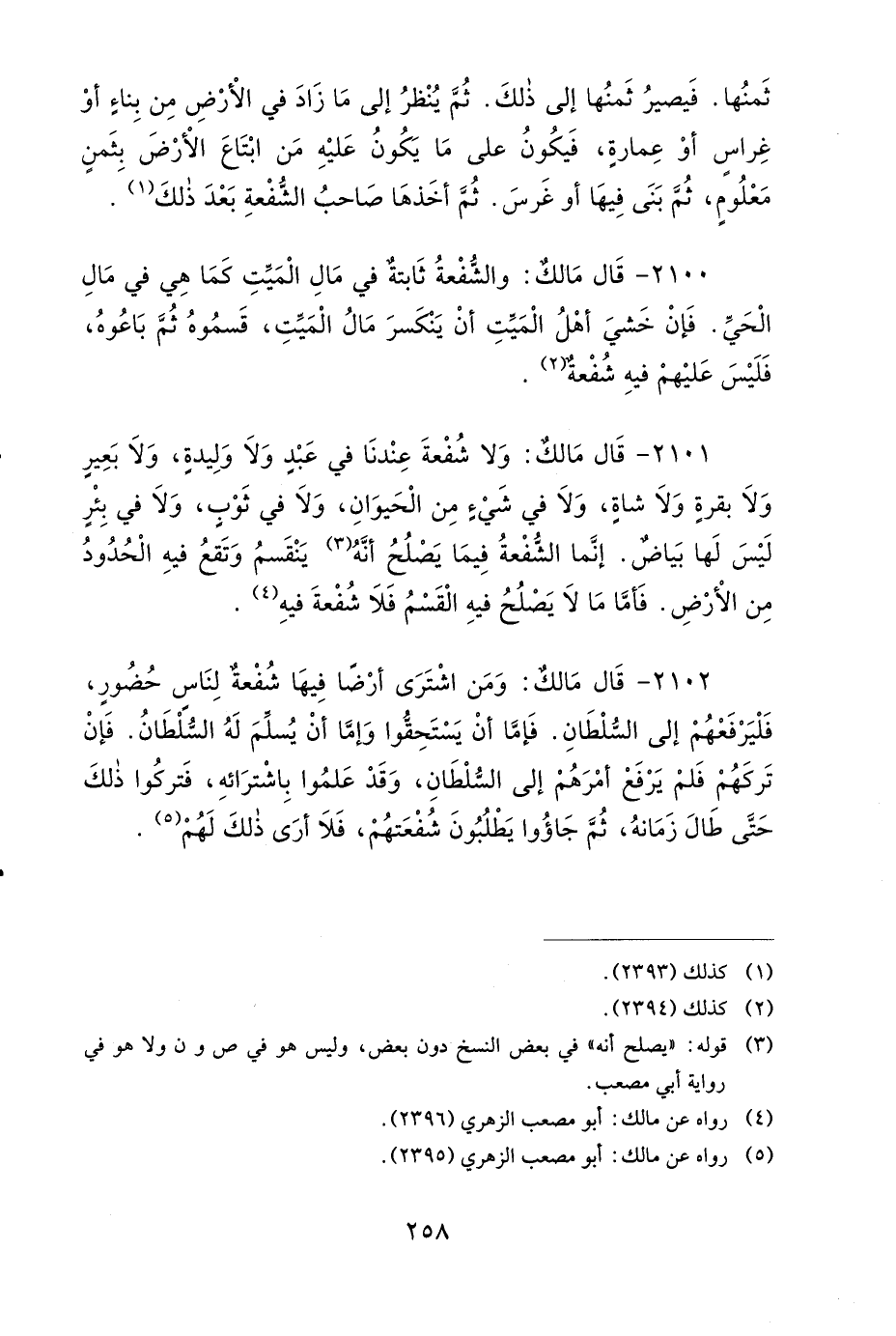 2101- قَالَ مَالِكٌ: وَلاَ شُفْعَةَ عِنْدَنَا فِي عَبْدٍ وَلاَ وَلِيدَةٍ، وَلاَ بَعِيرٍ وَلاَ بَقَرَةٍ وَلاَ شَاةٍ، وَلاَ فِي شَيْءٍ مِنَ الْحَيَوَانِ، وَلاَ فِي ثَوْبٍ، وَلاَ فِي بِئْرٍ لَيْسَ لَهَا بَيَاضٌ، إِنَّمَا الشُّفْعَةُ فِيمَا يَصْلُحُ أَنَّهُ يَنْقَسِمُ وَتَقَعُ فِيهِ الْحُدُودُ مِنَ الأَرْضِ، فَأَمَّا مَا لاَ يَصْلُحُ فِيهِ الْقَسْمُ، فَلاَ شُفْعَةَ فِيهِ.