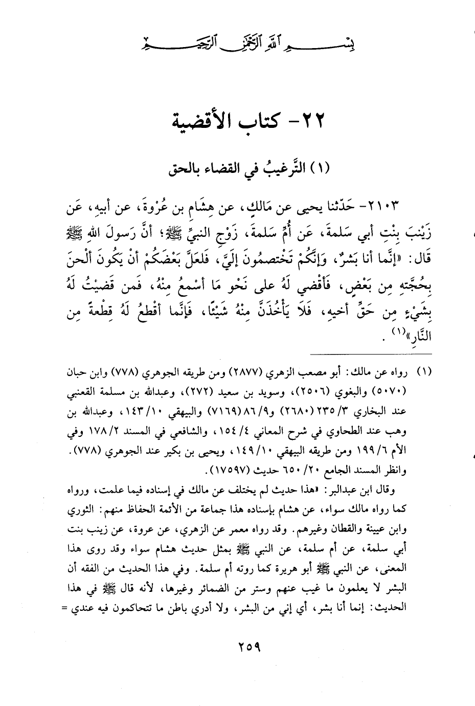 2103 - حَدَّثَنَا يحْيَى، عَنْ مَالِكٍ، عَنْ هِشَامِ بْنِ عُرْوَةَ، عَنْ أَبِيهِ، عَنْ زَيْنَبَ بِنْتِ أَبِي سَلَمَةَ، عَنْ أُمِّ سَلَمَةَ، زَوْجِ النَّبِيِّ صَلى الله عَلَيهِ وَسَلمَ، أَنَّ رَسُولَ اللهِ صَلى الله عَلَيهِ وَسَلمَ قَالَ: إِنَّمَا أَنَا بَشَرٌ، وَإِنَّكُمْ تَخْتَصِمُونَ إِلَيَّ، فَلَعَلَّ بَعْضَكُمْ أَنْ يَكُونَ أَلْحَنَ بِحُجَّتِهِ مِنْ بَعْضٍ، فَأَقْضِيَ لَهُ عَلَى نَحْوِ مَا أَسْمَعُ مِنْهُ، فَمَنْ قَضَيْتُ لَهُ بِشَيْءٍ مِنْ حَقِّ أَخِيهِ، فَلاَ يَأْخُذَنَّ مِنْهُ شَيْئًا، فَإِنَّمَا أَقْطَعُ لَهُ قِطْعَةً مِنَ النَّارِ.