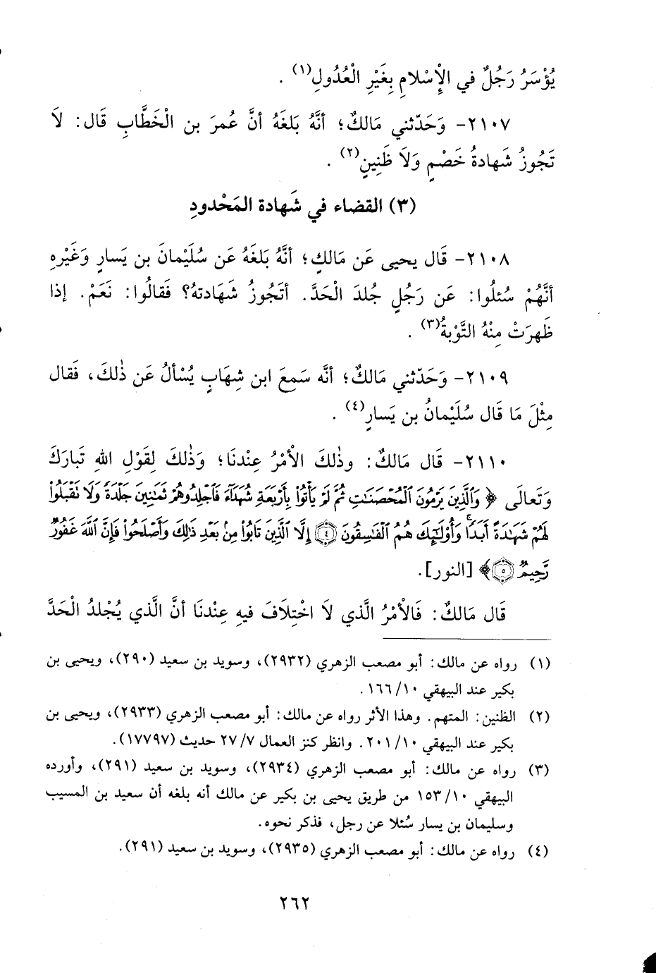 2110- قَالَ مَالِكٌ: وَذَلِكَ الأَمْرُ عِنْدَنَا، وَذَلِكَ لِقَوْلِ اللهِ تَبَارَكَ وَتَعَالَى: {وَالَّذِينَ يَرْمُونَ الْمُحْصَنَاتِ ثُمَّ لَمْ يَأْتُوا بِأَرْبَعَةِ شُهَدَاءَ فَاجْلِدُوهُمْ ثَمَانِينَ جَلْدَةً وَلاَ تَقْبَلُوا لَهُمْ شَهَادَةً أَبَدًا وَأُولَئِكَ هُمُ الْفَاسِقُونَ إِلاَّ الَّذِينَ تَابُوا مِنْ بَعْدِ ذَلِكَ وَأَصْلَحُوا فَإِنَّ اللهَ غَفُورٌ رَحِيمٌ}.