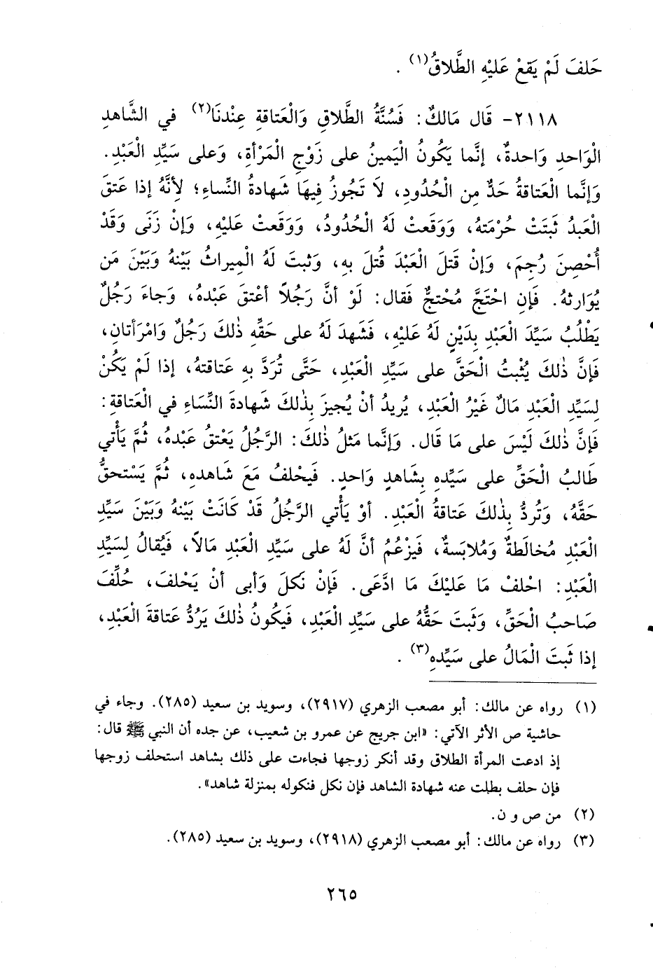 2118- قَالَ مَالِكٌ: فَسُنَّةُ الطَّلاَقِ وَالْعَتَاقَةِ عِنْدَنَا فِي الشَّاهِدِ الْوَاحِدِ وَاحِدَةٌ، إِنَّمَا يَكُونُ الْيَمِينُ عَلَى زَوْجِ الْمَرْأَةِ، وَعَلَى سَيِّدِ الْعَبْدِ، وَإِنَّمَا الْعَتَاقَةُ حَدٌّ مِنَ الْحُدُودِ، لاَ تَجُوزُ فِيهَا شَهَادَةُ النِّسَاءِ، لأَنَّهُ إِذَا عَتَقَ الْعَبْدُ ثَبَتَتْ حُرْمَتُهُ، وَوَقَعَتْ لَهُ الْحُدُودُ، وَوَقَعَتْ عَلَيْهِ، وَإِنْ زَنَى وَقَدْ أُحْصِنَ رُجِمَ، وَإِنْ قَتَلَ الْعَبْدَ قُتِلَ بِهِ، وَثَبَتَ لَهُ الْمِيرَاثُ بَيْنَهُ وَبَيْنَ مَنْ يُوَارِثُهُ، فَإِنِ احْتَجَّ مُحْتَجٌّ فَقَالَ: لَوْ أَنَّ رَجُلاً أَعْتَقَ عَبْدَهُ، وَجَاءَ رَجُلٌ يَطْلُبُ سَيِّدَ الْعَبْدِ بِدَيْنٍ لَهُ عَلَيْهِ، فَشَهِدَ لَهُ عَلَى حَقِّهِ ذَلِكَ رَجُلٌ وَامْرَأَتَانِ، فَإِنَّ ذَلِكَ يُثْبِتُ الْحَقَّ عَلَى سَيِّدِ الْعَبْدِ، حَتَّى تُرَدَّ بِهِ عَتَاقَتُهُ، إِذَا لَمْ يَكُنْ لِسَيِّدِ الْعَبْدِ مَالٌ غَيْرُ الْعَبْدِ، يُرِيدُ أَنْ يُجِيزَ بِذَلِكَ شَهَادَةَ النِّسَاءِ فِي الْعَتَاقَةِ، فَإِنَّ ذَلِكَ لَيْسَ عَلَى مَا قَالَ، وَإِنَّمَا مَثَلُ ذَلِكَ الرَّجُلُ يَعْتِقُ عَبْدَهُ، ثُمَّ يَأْتِي طَالِبُ الْحَقِّ عَلَى سَيِّدِهِ بِشَاهِدٍ وَاحِدٍ، فَيَحْلِفُ مَعَ شَاهِدِهِ، ثُمَّ يَسْتَحِقُّ حَقَّهُ، وَتُرَدُّ بِذَلِكَ عَتَاقَةُ الْعَبْدِ، أَوْ يَأْتِي الرَّجُلُ قَدْ كَانَتْ بَيْنَهُ وَبَيْنَ سَيِّدِ الْعَبْدِ مُخَالَطَةٌ وَمُلاَبَسَةٌ، فَيَزْعُمُ أَنَّ لَهُ عَلَى سَيِّدِ الْعَبْدِ مَالاً، فَيُقَالُ لِسَيِّدِ الْعَبْدِ: احْلِفْ مَا عَلَيْكَ مَا ادَّعَى، فَإِنْ نَكَلَ وَأَبَى أَنْ يَحْلِفَ، حُلِّفَ صَاحِبُ الْحَقِّ، وَثَبَتَ حَقُّهُ عَلَى سَيِّدِ الْعَبْدِ، فَيَكُونُ ذَلِكَ يَرُدُّ عَتَاقَةَ الْعَبْدِ، إِذَا ثَبَتَ الْمَالُ عَلَى سَيِّدِهِ.