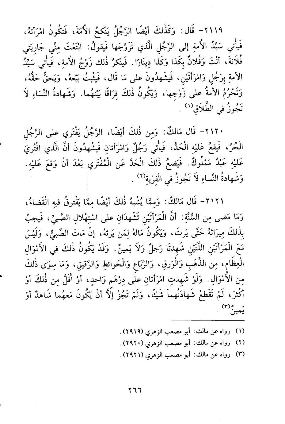 2119- قَالَ: وَكَذَلِكَ أَيْضًا الرَّجُلُ يَنْكِحُ الأَمَةَ، فَتَكُونُ امْرَأَتَهُ، فَيَأْتِي سَيِّدُ الأَمَةِ إِلَى الرَّجُلِ الَّذِي تَزَوَّجَهَا فَيَقُولُ: ابْتَعْتَ مِنِّي جَارِيَتِي فُلاَنَةَ، أَنْتَ وَفُلاَنٌ بِكَذَا وَكَذَا دِينَارًا، فَيُنْكِرُ ذَلِكَ زَوْجُ الأَمَةِ، فَيَأْتِي سَيِّدُ الأَمَةِ بِرَجُلٍ وَامْرَأَتَيْنِ، فَيَشْهَدُونَ عَلَى مَا قَالَ، فَيَثْبُتُ بَيْعُهُ، وَيَحِقُّ حَقُّهُ، وَتَحْرُمُ الأَمَةُ عَلَى زَوْجِهَا، وَيَكُونُ ذَلِكَ فِرَاقًا بَيْنَهُمَا، وَشَهَادَةُ النِّسَاءِ لاَ تَجُوزُ فِي الطَّلاَقِ.