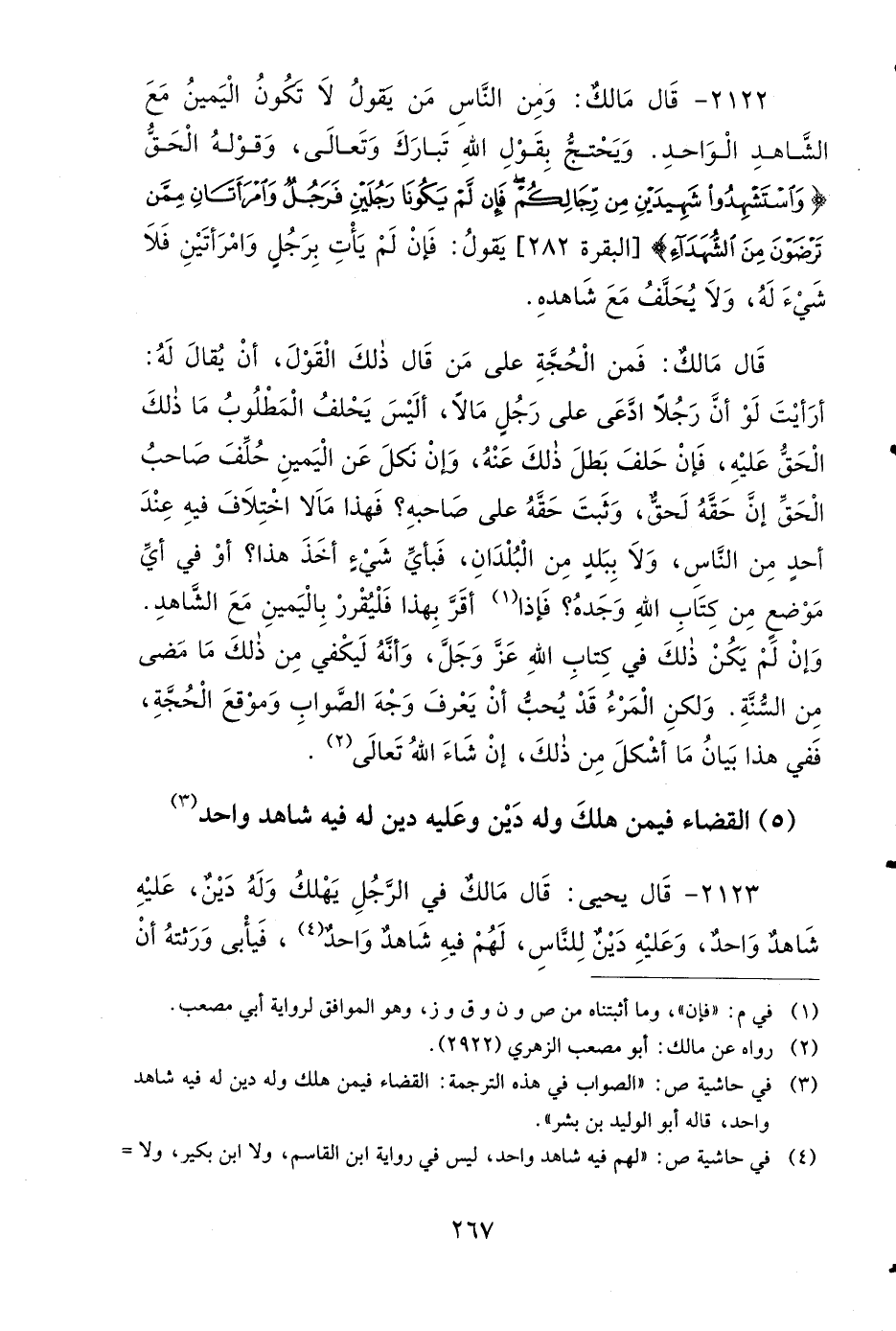 2122 - قَالَ مَالِكٌ: وَمِنَ النَّاسِ مَنْ يَقُولُ: لاَ تَكُونُ الْيَمِينُ مَعَ الشَّاهِدِ الْوَاحِدِ، وَيَحْتَجُّ بِقَوْلِ اللهِ تَبَارَكَ وَتَعَالَى، وَقَوْلُهُ الْحَقُّ: {وَاسْتَشْهِدُوا شَهِيدَيْنِ مِنْ رِجَالِكُمْ فَإِنْ لَمْ يَكُونَا رَجُلَيْنِ فَرَجُلٌ وَامْرَأَتَانِ مِمَّنْ تَرْضَوْنَ مِنَ الشُّهَدَاءِ} يَقُولُ: فَإِنْ لَمْ يَأْتِ بِرَجُلٍ وَامْرَأَتَيْنِ، فَلاَ شَيْءَ لَهُ، وَلاَ يُحَلَّفُ مَعَ شَاهِدِهِ.