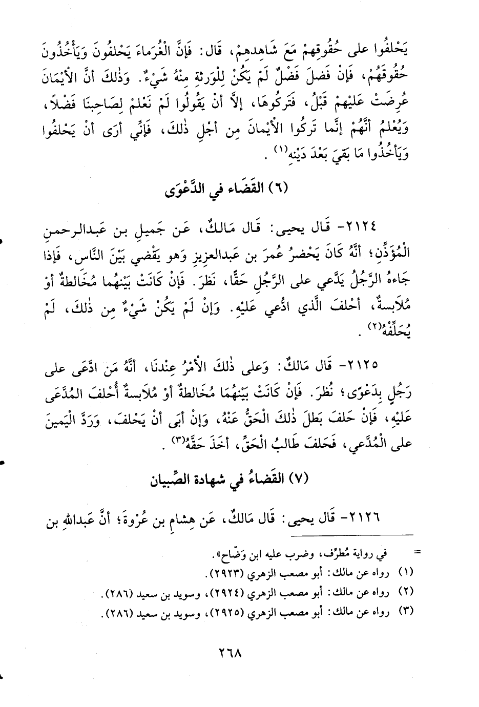 2126- قَالَ يَحْيَى: قَالَ مَالِكٌ: عَنْ هِشَامِ بْنِ عُرْوَةَ، أَنَّ عَبْدَ اللهِ بْنَ الزُّبَيْرِ كَانَ يَقْضِي بِشَهَادَةِ الصِّبْيَانِ، فِيمَا بَيْنَهُمْ مِنَ الْجِرَاحِ.