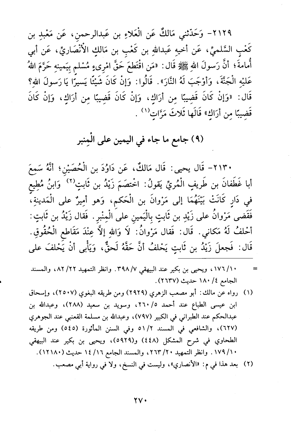 2130- قَالَ يَحْيَى: قَالَ مَالِكٌ: عَنْ دَاوُدَ بْنِ الْحُصَيْنِ، أَنَّهُ سَمِعَ أَبَا غَطَفَانَ بْنَ طَرِيفٍ الْمُرِّيَّ يَقُولُ: اخْتَصَمَ زَيْدُ بْنُ ثَابِتٍ، وَابْنُ مُطِيعٍ، فِي دَارٍ كَانَتْ بَيْنَهُمَا، إِلَى مَرْوَانَ بْنِ الْحَكَمِ، وَهُوَ أَمِيرٌ عَلَى الْمَدِينَةِ، فَقَضَى مَرْوَانُ عَلَى زَيْدِ بْنِ ثَابِتٍ بِالْيَمِينِ عَلَى الْمِنْبَرِ، فَقَالَ زَيْدُ بْنُ ثَابِتٍ: أَحْلِفُ لَهُ مَكَانِي، قَالَ: فَقَالَ مَرْوَانُ: لاَ وَاللَّهِ، إِلاَّ عِنْدَ مَقَاطِعِ الْحُقُوقِ، قَالَ: فَجَعَلَ زَيْدُ بْنُ ثَابِتٍ يَحْلِفُ أَنَّ حَقَّهُ لَحَقٌّ، وَيَأْبَى أَنْ يَحْلِفَ عَلَى الْمِنْبَرِ، قَالَ: فَجَعَلَ مَرْوَانُ بْنُ الْحَكَمِ يَعْجَبُ مِنْ ذَلِكَ.