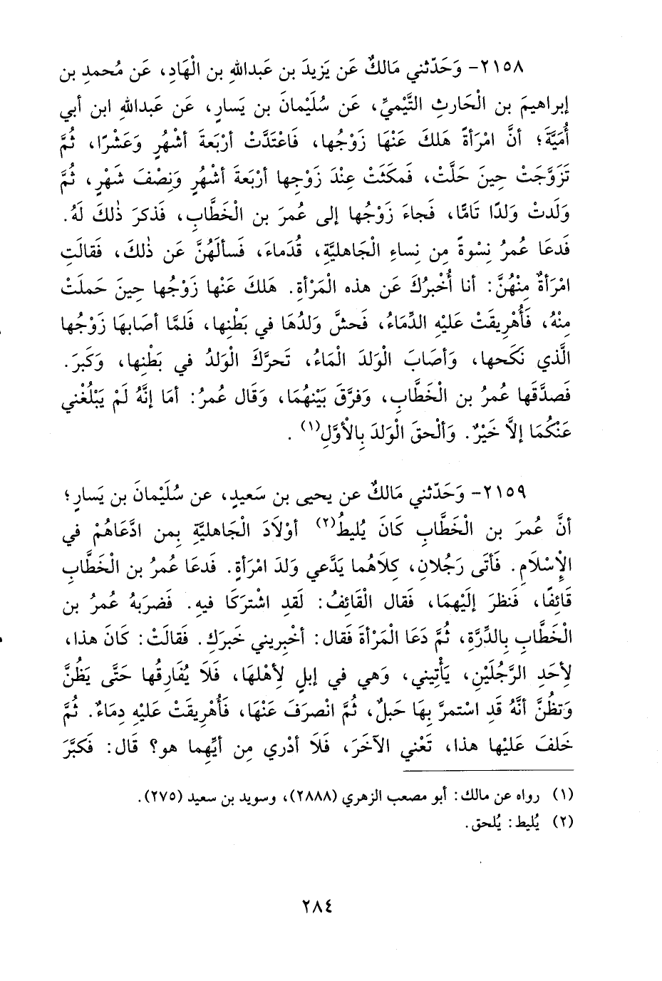 2158- وَحَدَّثَنِي مَالِكٌ، عَنْ يَزِيدَ بْنِ عَبْدِ اللهِ بْنِ الْهَادِ، عَنْ مُحَمَّدِ بْنِ إِبْرَاهِيمَ بْنِ الْحَارِثِ التَّيْمِيِّ، عَنْ سُلَيْمَانَ بْنِ يَسَارٍ، عَنْ عَبْدِ اللهِ بْنِ أَبِي أُمَيَّةَ، أَنَّ امْرَأَةً هَلَكَ عَنْهَا زَوْجُهَا، فَاعْتَدَّتْ أَرْبَعَةَ أَشْهُرٍ وَعَشْرًا، ثُمَّ تَزَوَّجَتْ حِينَ حَلَّتْ، فَمَكَثَتْ عِنْدَ زَوْجِهَا أَرْبَعَةَ أَشْهُرٍ وَنِصْفَ شَهْرٍ، ثُمَّ وَلَدَتْ وَلَدًا تَامًّا، فَجَاءَ زَوْجُهَا إِلَى عُمَرَ بْنِ الْخَطَّابِ، فَذَكَرَ ذَلِكَ لَهُ، فَدَعَا عُمَرُ نِسْوَةً مِنْ نِسَاءِ الْجَاهِلِيَّةِ قُدَمَاءَ، فَسَأَلَهُنَّ عَنْ ذَلِكَ، فَقَالَتِ امْرَأَةٌ مِنْهُنَّ: أَنَا أُخْبِرُكَ عَنْ هَذِهِ الْمَرْأَةِ، هَلَكَ عَنْهَا زَوْجُهَا حِينَ حَمَلَتْ مِنْهُ، فَأُهَرِيقَتْ عَلَيْهِ الدِّمَاءُ، فَحَشَّ وَلَدُهَا فِي بَطْنِهَا، فَلَمَّا أَصَابَهَا زَوْجُهَا الَّذِي نَكَحَهَا، وَأَصَابَ الْوَلَدَ الْمَاءُ، تَحَرَّكَ الْوَلَدُ فِي بَطْنِهَا، وَكَبِرَ، فَصَدَّقَهَا عُمَرُ بْنُ الْخَطَّابِ، وَفَرَّقَ بَيْنَهُمَا، وَقَالَ عُمَرُ: أَمَا إِنَّهُ لَمْ يَبْلُغْنِي عَنْكُمَا إِلاَّ خَيْرٌ، وَأَلْحَقَ الْوَلَدَ بِالأَوَّلِ.