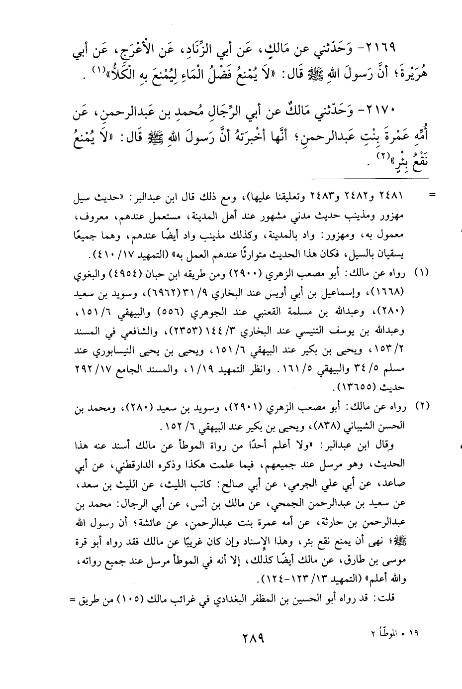 2170- وحَدَّثَنِي مَالِكٌ، عَنْ أَبِي الرِّجَالِ مُحَمَّدِ بْنِ عَبْدِ الرَّحْمَنِ، عَنْ أُمِّهِ عَمْرَةَ بِنْتِ عَبْدِ الرَّحْمَنِ، أَنَّهَا أَخْبَرَتْهُ، أَنَّ رَسُولَ اللهِ صَلى الله عَلَيهِ وَسَلمَ قَالَ: لاَ يُمْنَعُ نَقْعُ بِئْرٍ.