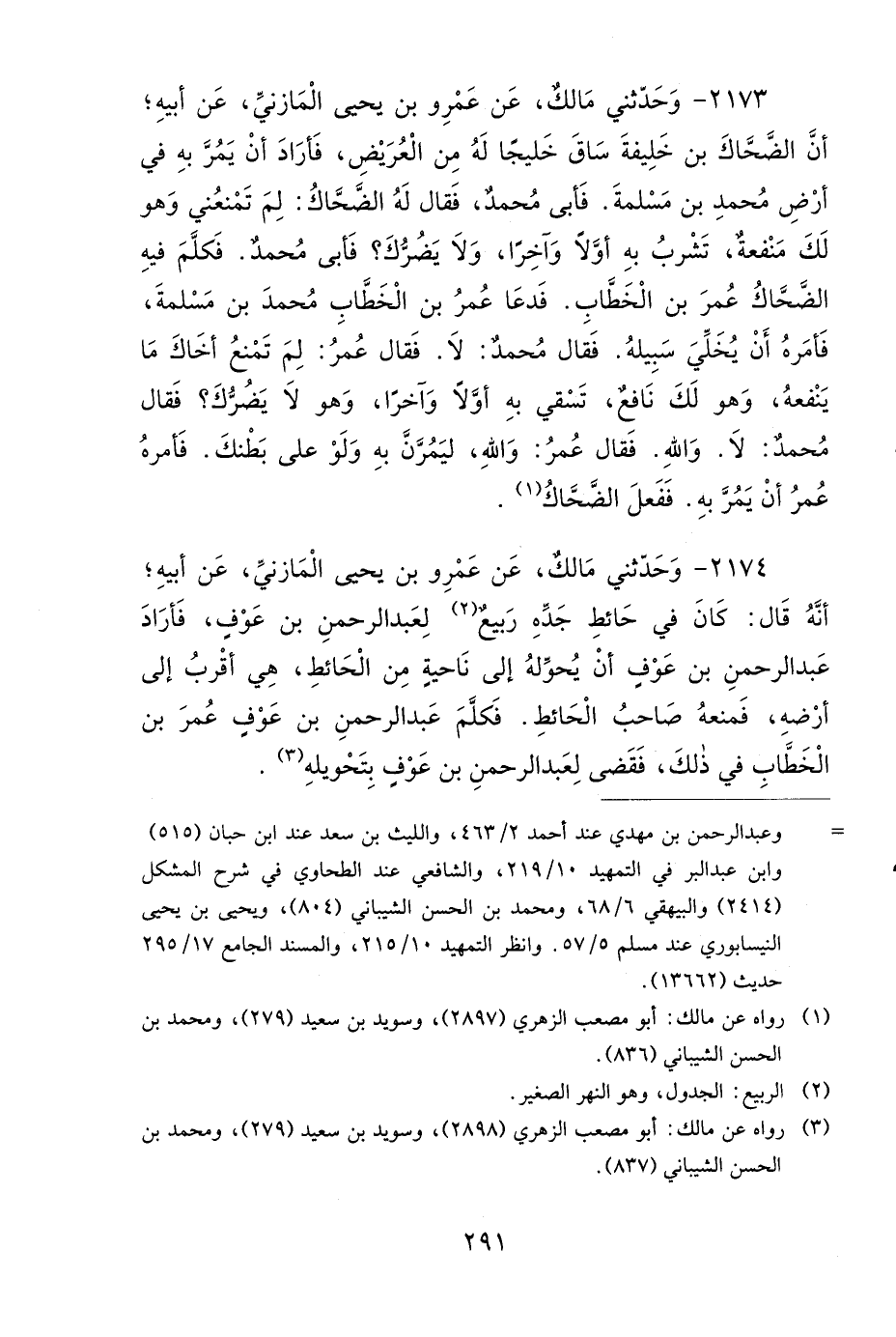 2174- وَحَدَّثَنِي مَالِكٌ، عَنْ عَمْرِو بْنِ يَحْيَى الْمَازِنِيِّ، عَنْ أَبِيهِ، أَنَّهُ قَالَ: كَانَ فِي حَائِطِ جَدِّهِ رَبِيعٌ لِعَبْدِ الرَّحْمَنِ بْنِ عَوْفٍ، فَأَرَادَ عَبْدُ الرَّحْمَنِ بْنُ عَوْفٍ أَنْ يُحَوِّلَهُ إِلَى نَاحِيَةٍ مِنَ الْحَائِطِ، هِيَ أَقْرَبُ إِلَى أَرْضِهِ، فَمَنَعَهُ صَاحِبُ الْحَائِطِ، فَكَلَّمَ عَبْدُ الرَّحْمَنِ بْنُ عَوْفٍ عُمَرَ بْنَ الْخَطَّابِ فِي ذَلِكَ، فَقَضَى لِعَبْدِ الرَّحْمَنِ بْنِ عَوْفٍ بِتَحْوِيلِهِ.