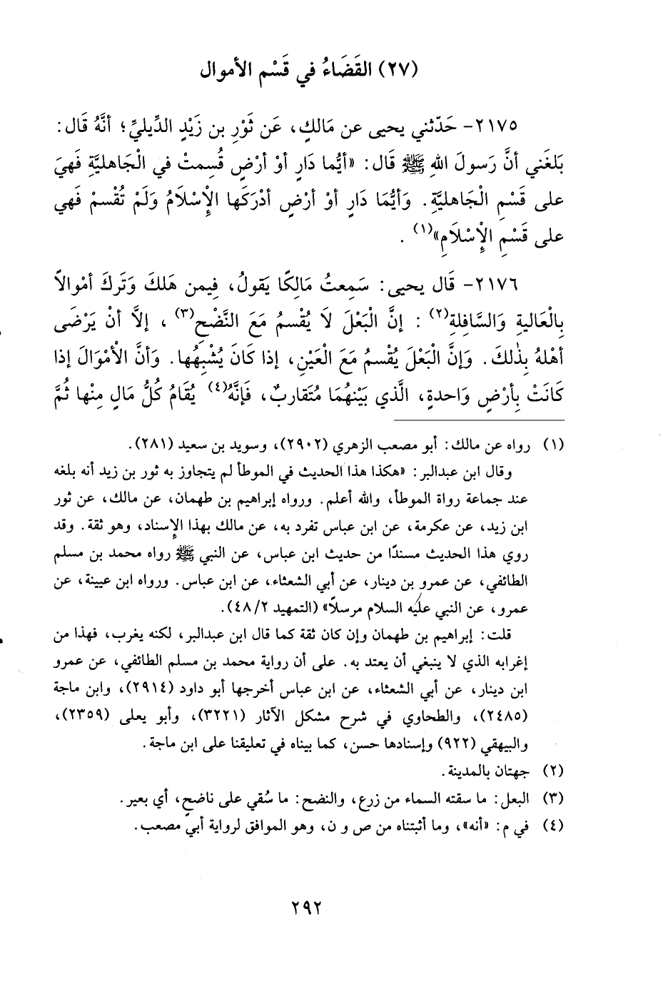 2175- حَدَّثَنِي يَحْيَى، عَنْ مَالِكٍ، عَنْ ثَوْرِ بْنِ زَيْدٍ الدِّيلِيِّ، أَنَّهُ قَالَ: بَلَغَنِي أَنَّ رَسُولَ اللهِ صَلى الله عَلَيهِ وَسَلمَ قَالَ: أَيُّمَا دَارٍ أَوْ أَرْضٍ قُسِمَتْ فِي الْجَاهِلِيَّةِ، فَهِيَ عَلَى قَسْمِ الْجَاهِلِيَّةِ، وَأَيُّمَا دَارٍ أَوْ أَرْضٍ أَدْرَكَهَا الإِسْلاَمُ وَلَمْ تُقْسَمْ، فَهِيَ عَلَى قَسْمِ الإِسْلاَمِ.