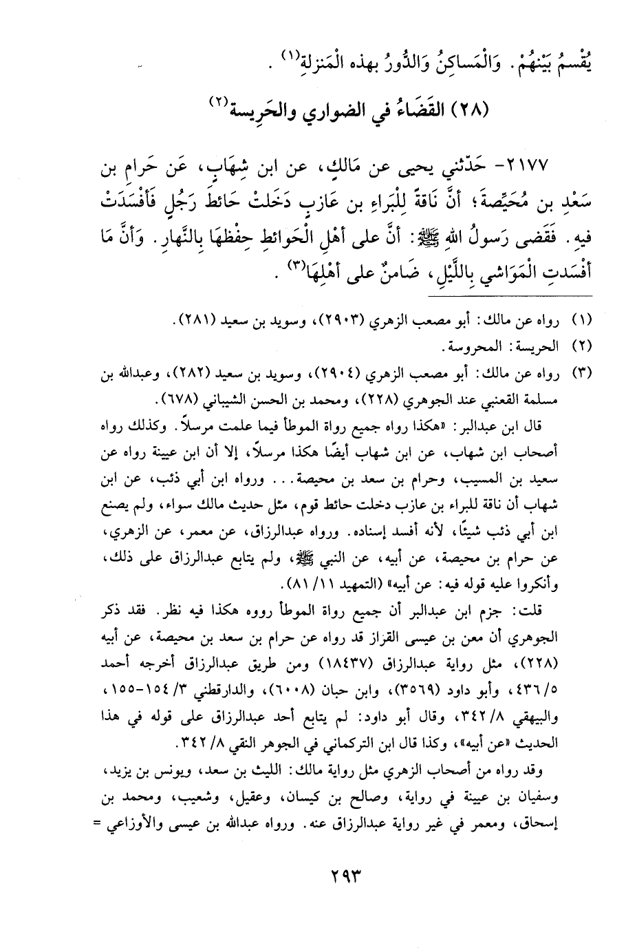 2177- حَدَّثَنِي يَحْيَى، عَنْ مَالِكٍ، عَنِ ابْنِ شِهَابٍ، عَنْ حَرَامِ بْنِ سَعْدِ بْنِ مُحَيِّصَةَ، أَنَّ نَاقَةً لِلْبَرَاءِ بْنِ عَازِبٍ، دَخَلَتْ حَائِطَ رَجُلٍ، فَأَفْسَدَتْ فِيهِ، فَقَضَى رَسُولُ اللهِ صَلى الله عَلَيهِ وَسَلمَ: أَنَّ عَلَى أَهْلِ الْحَوَائِطِ حِفْظَهَا بِالنَّهَارِ، وَأَنَّ مَا أَفْسَدَتِ الْمَوَاشِي بِاللَّيْلِ ضَامِنٌ عَلَى أَهْلِهَا.