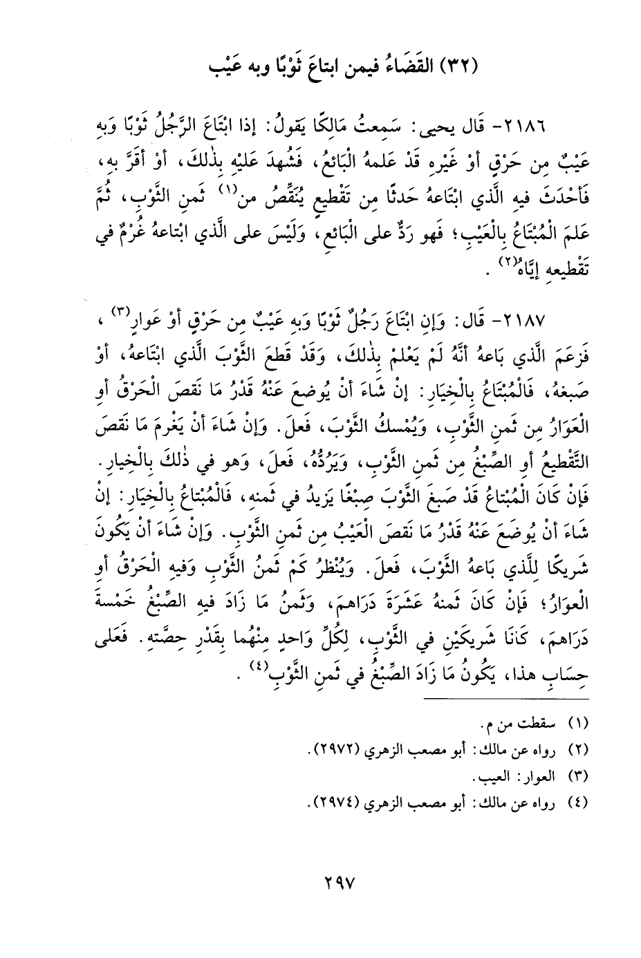 2186- قَالَ يَحْيَى: سَمِعْتُ مَالِكًا يَقُولُ: إِذَا ابْتَاعَ الرَّجُلُ ثَوْبًا وَبِهِ عَيْبٌ مِنْ حَرْقٍ أَوْ غَيْرِهِ، قَدْ عَلِمَهُ الْبَائِعُ، فَشُهِدَ عَلَيْهِ بِذَلِكَ، أَوْ أَقَرَّ بِهِ، فَأَحْدَثَ فِيهِ الَّذِي ابْتَاعَهُ حَدَثًا مِنْ تَقْطِيعٍ يُنَقِّصُ مِنْ ثَمَنَ الثَّوْبِ، ثُمَّ عَلِمَ الْمُبْتَاعُ بِالْعَيْبِ، فَهُوَ رَدٌّ عَلَى الْبَائِعِ، وَلَيْسَ عَلَى الَّذِي ابْتَاعَهُ غُرْمٌ فِي تَقْطِيعِهِ إِيَّاهُ.