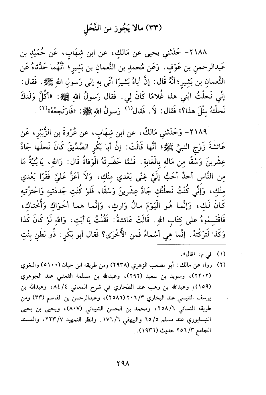 2188- حَدَّثَنِي يَحْيَى، عَنْ مَالِكٍ، عَنِ ابْنِ شِهَابٍ، عَنْ حُمَيْدِ بْنِ عَبْدِ الرَّحْمَنِ بْنِ عَوْفٍ، وَعَنْ مُحَمَّدِ بْنِ النُّعْمَانِ بْنِ بَشِيرٍ، أَنَّهُمَا حَدَّثَاهُ عَنِ النُّعْمَانِ بْنِ بَشِيرٍ، أَنَّهُ قَالَ: إِنَّ أَبَاهُ بَشِيرًا أَتَى بِهِ إِلَى رَسُولِ اللهِ صَلى الله عَلَيهِ وَسَلمَ فَقَالَ: إِنِّي نَحَلْتُ ابْنِي هَذَا غُلاَمًا كَانَ لِي، فَقَالَ رَسُولُ اللهِ صَلى الله عَلَيهِ وَسَلمَ: أَكُلَّ وَلَدِكَ نَحَلْتَهُ مِثْلَ هَذَا؟ فَقَالَ: لاَ، فَقَالَ رَسُولُ اللهِ صَلى الله عَلَيهِ وَسَلمَ: فَارْتَجِعْهُ.