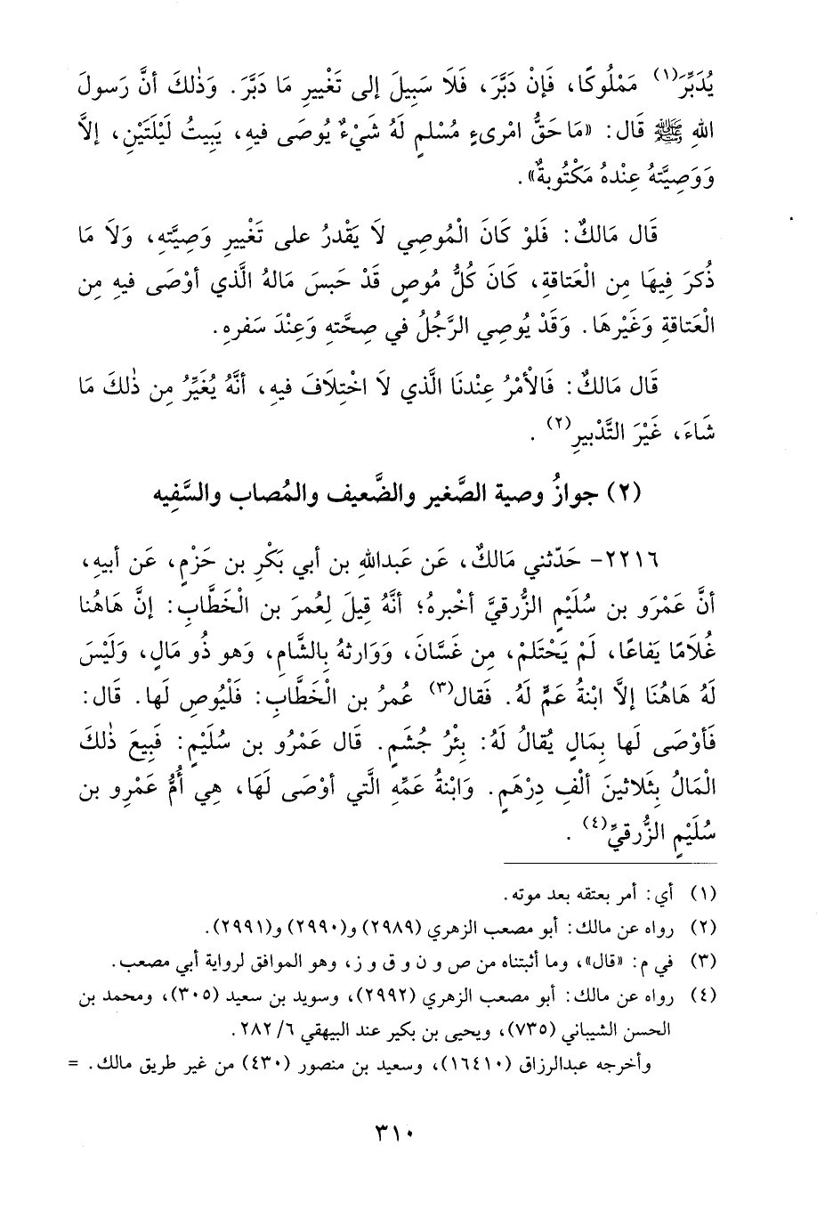 2216- حَدَّثَنِي مَالِكٌ، عَنْ عَبْدِ اللهِ بْنِ أَبِي بَكْرِ بْنِ حَزْمٍ، عَنْ أَبِيهِ، أَنَّ عَمْرَو بْنَ سُلَيْمٍ الزُّرَقِيَّ أَخْبَرَهُ، أَنَّهُ قِيلَ لِعُمَرَ بْنِ الْخَطَّابِ: إِنَّ هَاهُنَا غُلاَمًا يَفَاعًا لَمْ يَحْتَلِمْ مِنْ غَسَّانَ، وَوَارِثُهُ بِالشَّامِ، وَهُوَ ذُو مَالٍ، وَلَيْسَ لَهُ هَاهُنَا إِلاَّ ابْنَةُ عَمٍّ لَهُ، فَقَالَ عُمَرُ بْنُ الْخَطَّابِ: فَلْيُوصِ لَهَا، قَالَ: فَأَوْصَى لَهَا بِمَالٍ، يُقَالَ لَهُ: بِئْرُ جُشَمٍ، قَالَ عَمْرُو بْنُ سُلَيْمٍ: فَبِيعَ ذَلِكَ الْمَالُ بِثَلاَثِينَ أَلْفَ دِرْهَمٍ، وَابْنَةُ عَمِّهِ الَّتِي أَوْصَى لَهَا، هِيَ: أُمُّ عَمْرِو بْنِ سُلَيْمٍ الزُّرَقِيِّ.