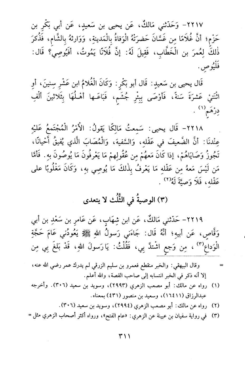 2218- قَالَ يَحْيَى: سَمِعْتُ مَالِكًا يَقُولُ: الأَمْرُ الْمُجْتَمَعُ عَلَيْهِ عِنْدَنَا: أَنَّ الضَّعِيفَ فِي عَقْلِهِ، وَالسَّفِيهَ، وَالْمُصَابَ الَّذِي يُفِيقُ أَحْيَانًا، تَجُوزُ وَصَايَاهُمْ، إِذَا كَانَ مَعَهُمْ مِنْ عُقُولِهِمْ، مَا يَعْرِفُونَ مَا يُوصُونَ بِهِ، فَأَمَّا مَنْ لَيْسَ مَعَهُ مِنْ عَقْلِهِ مَا يَعْرِفُ بِذَلِكَ مَا يُوصِي بِهِ، وَكَانَ مَغْلُوبًا عَلَى عَقْلِهِ، فَلاَ وَصِيَّةَ لَهُ.