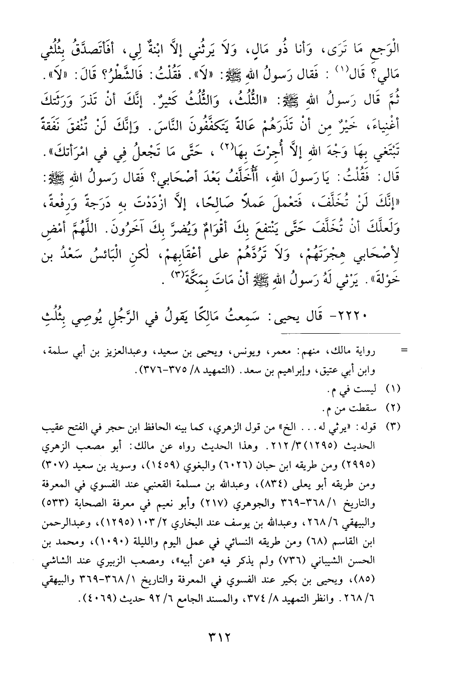 2220- قَالَ يَحْيَى: سَمِعْتُ مَالِكًا يَقُولُ فِي الرَّجُلِ يُوصِي بِثُلُثِ مَالِهِ لِرَجُلٍ، وَيَقُولُ: غُلاَمِي يَخْدُمُ فُلاَنًا مَا عَاشَ، ثُمَّ هُوَ حُرٌّ، فَيُنْظَرُ فِي ذَلِكَ، فَيُوجَدُ الْعَبْدُ ثُلُثَ مَالِ الْمَيِّتِ، قَالَ: فَإِنَّ خِدْمَةَ الْعَبْدِ تُقَوَّمُ، ثُمَّ يَتَحَاصَّانِ، يُحَاصُّ الَّذِي أُوصِيَ لَهُ بِالثُّلُثِ بِثُلُثِهِ، وَيُحَاصُّ الَّذِي أُوصِيَ لَهُ بِخِدْمَةِ الْعَبْدِ، بِمَا قُوِّمَ لَهُ مِنْ خِدْمَةِ الْعَبْدِ، فَيَأْخُذُ كُلُّ وَاحِدٍ مِنْهُمَا مِنْ خِدْمَةِ الْعَبْدِ، أَوْ مِنْ إِجَارَتِهِ، إِنْ كَانَتْ لَهُ إِجَارَةٌ، بِقَدْرِ حِصَّتِهِ، فَإِذَا مَاتَ الَّذِي جُعِلَتْ لَهُ خِدْمَةُ الْعَبْدِ مَا عَاشَ، عَتَقَ الْعَبْدُ.