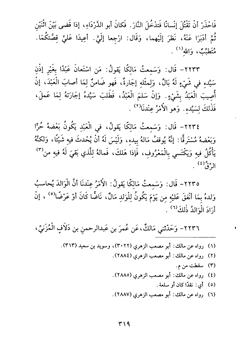 2234- قَالَ: وسَمِعْتُ مَالِكًا يَقُولُ فِي الْعَبْدِ: يَكُونُ بَعْضُهُ حُرًّا وَبَعْضُهُ مُسْتَرَقًّا، إِنَّهُ يُوقَفُ مَالُهُ بِيَدِهِ، وَلَيْسَ لَهُ أَنْ يُحْدِثَ فِيهِ شَيْئًا، وَلَكِنَّهُ يَأْكُلُ فِيهِ وَيَكْتَسِي بِالْمَعْرُوفِ، فَإِذَا هَلَكَ، فَمَالُهُ لِلَّذِي بَقِيَ لَهُ فِيهِ مِنَ الرِّقُّ.