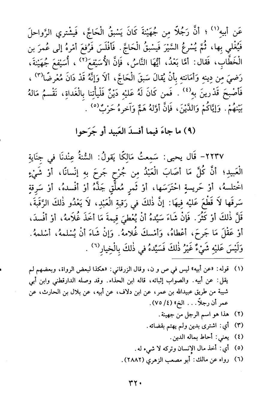 2237- قَالَ يَحْيَى: سَمِعْتُ مَالِكًا يَقُولُ: السُّنَّةُ عِنْدَنَا فِي جِنَايَةِ الْعَبِيدِ، أَنَّ كُلَّ مَا أَصَابَ الْعَبْدُ مِنْ جُرْحٍ جَرَحَ بِهِ إِنْسَانًا، أَوْ شَيْءٍ اخْتَلَسَهُ، أَوْ حَرِيسَةٍ احْتَرَسَهَا، أَوْ ثَمَرٍ مُعَلَّقٍ، جَذَّهُ أَوْ أَفْسَدَهُ، أَوْ سَرِقَةٍ سَرَقَهَا لاَ قَطْعَ عَلَيْهِ فِيهَا، إِنَّ ذَلِكَ فِي رَقَبَةِ الْعَبْدِ، لاَ يَعْدُو ذَلِكَ الرَّقَبَةَ، قَلَّ ذَلِكَ أَوْ كَثُرَ، فَإِنْ شَاءَ سَيِّدُهُ أَنْ يُعْطِيَ قِيمَةَ مَا أَخَذَ غُلاَمُهُ، أَوْ أَفْسَدَ أَوْ عَقْلَ مَا جَرَحَ، أَعْطَاهُ، وَأَمْسَكَ غُلاَمَهُ، وَإِنْ شَاءَ أَنْ يُسْلِمَهُ أَسْلَمَهُ، وَلَيْسَ عَلَيْهِ شَيْءٌ غَيْرُ ذَلِكَ، فَسَيِّدُهُ فِي ذَلِكَ بِالْخِيَارِ.