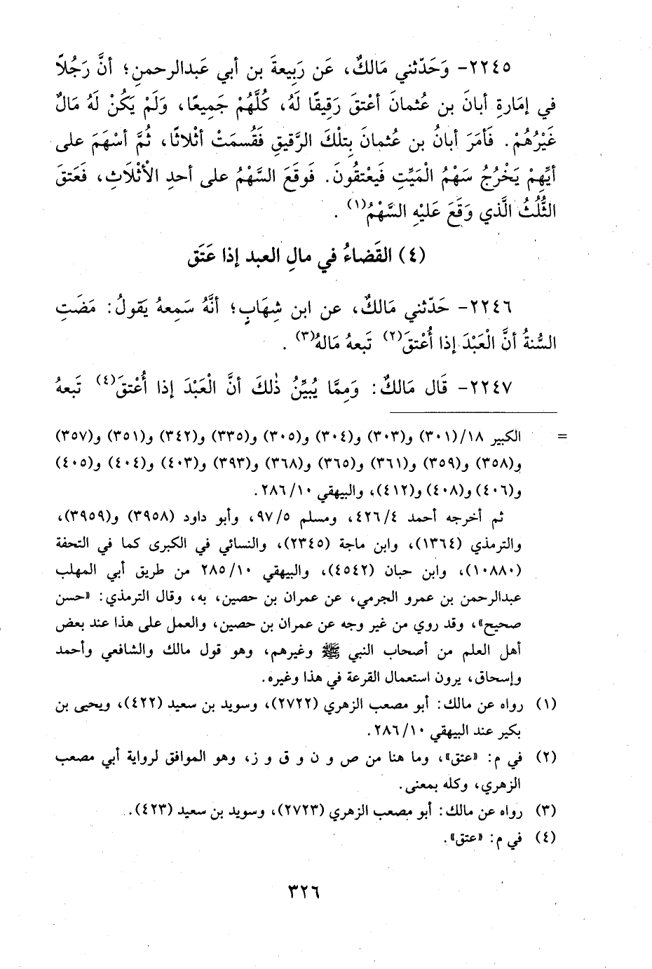 2245- وَحَدَّثَنِي مَالِكٌ، عَنْ رَبِيعَةَ بْنِ أَبِي عَبْدِ الرَّحْمَنِ، أَنَّ رَجُلاً فِي إِمَارَةِ أَبَانَ بْنِ عُثْمَانَ، أَعْتَقَ رَقِيقًا لَهُ، كُلَّهُمْ جَمِيعًا، وَلَمْ يَكُنْ لَهُ مَالٌ غَيْرُهُمْ، فَأَمَرَ أَبَانُ بْنُ عُثْمَانَ، بِتِلْكَ الرَّقِيقِ، فَقُسِمَتْ أَثْلاَثًا، ثُمَّ أَسْهَمَ عَلَى أَيِّهِمْ يَخْرُجُ سَهْمُ الْمَيِّتِ، فَيَعْتِقُونَ، فَوَقَعَ السَّهْمُ عَلَى أَحَدِ الأَثْلاَثِ، فَعَتَقَ الثُّلُثُ الَّذِي وَقَعَ عَلَيْهِ السَّهْمُ.