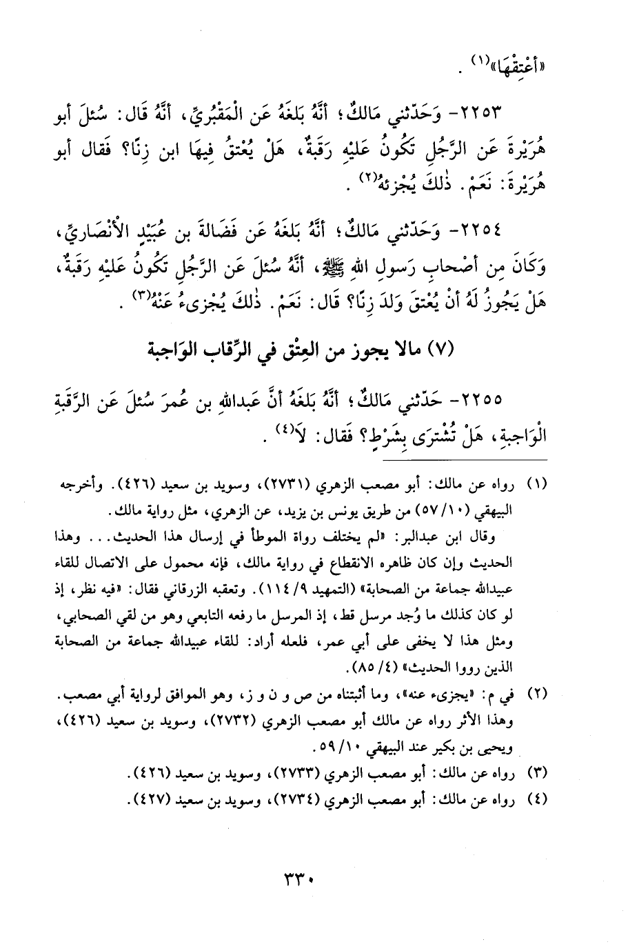 2254- وَحَدَّثَنِي مَالِكٌ، أَنَّهُ بَلَغَهُ عَنْ فَضَالَةَ بْنِ عُبَيْدٍ الأَنْصَارِيِّ، وَكَانَ مِنْ أَصْحَابِ رَسُولِ اللهِ صَلى الله عَلَيهِ وَسَلمَ، أَنَّهُ سُئِلَ عَنِ الرَّجُلِ تَكُونُ عَلَيْهِ رَقَبَةٌ، هَلْ يَجُوزُ لَهُ أَنْ يُعْتِقَ وَلَدَ زِنًا؟ قَالَ: نَعَمْ، ذَلِكَ يُجْزِئُ عَنْهُ.