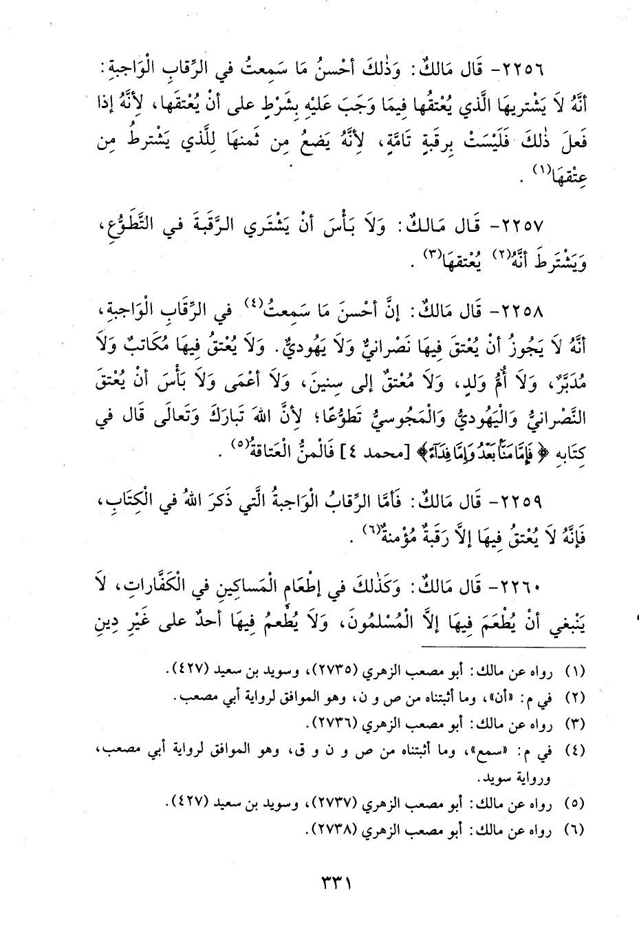 2259 - قَالَ مَالِكٌ: فَأَمَّا الرِّقَابُ الْوَاجِبَةُ الَّتِي ذَكَرَ اللهُ فِي الْكِتَابِ، فَإِنَّهُ لاَ يُعْتَقُ فِيهَا إِلاَّ رَقَبَةٌ مُؤْمِنَةٌ.