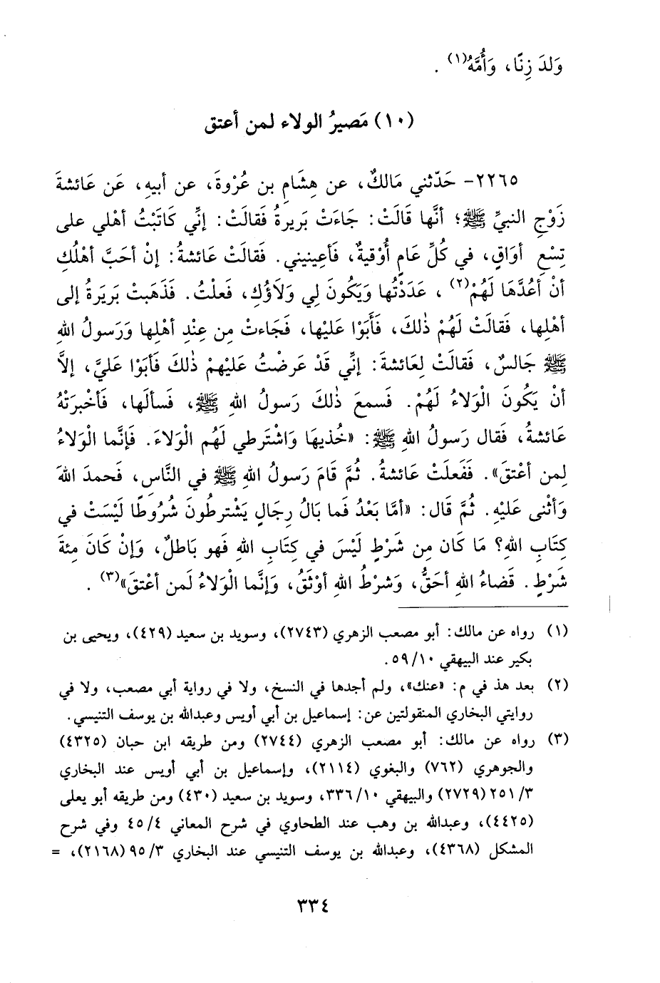2265 - حَدَّثَنِي مَالِكٌ، عَنْ هِشَامِ بْنِ عُرْوَةَ، عَنْ أَبِيهِ، عَنْ عَائِشَةَ، زَوْجِ النَّبِيِّ صَلى الله عَلَيهِ وَسَلمَ، أَنَّهَا قَالَتْ: جَاءَتْ بَرِيرَةُ فَقَالَتْ: إِنِّي كَاتَبْتُ أَهْلِي عَلَى تِسْعِ أَوَاقٍ، فِي كُلِّ عَامٍ أُوقِيَّةٌ، فَأَعِينِينِي، فَقَالَتْ عَائِشَةُ: إِنْ أَحَبَّ أَهْلُكِ أَنْ أَعُدَّهَا لَهُمْ، عَدَدْتُهَا وَيَكُونَ لِي وَلاَؤُكِ فَعَلْتُ، فَذَهَبَتْ بَرِيرَةُ إِلَى أَهْلِهَا، فَقَالَتْ لَهُمْ ذَلِكَ، فَأَبَوْا عَلَيْهَا، فَجَاءَتْ مِنْ عِنْدِ أَهْلِهَا وَرَسُولُ اللهِ صَلى الله عَلَيهِ وَسَلمَ جَالِسٌ، فَقَالَتْ لِعَائِشَةَ: إِنِّي قَدْ عَرَضْتُ عَلَيْهِمْ ذَلِكَ، فَأَبَوْا عَلَيَّ إِلاَّ أَنْ يَكُونَ الْوَلاَءُ لَهُمْ، فَسَمِعَ ذَلِكَ رَسُولُ اللهِ صَلى الله عَلَيهِ وَسَلمَ، فَسَأَلَهَا، فَأَخْبَرَتْهُ عَائِشَةُ، فَقَالَ رَسُولُ اللهِ صَلى الله عَلَيهِ وَسَلمَ: خُذِيهَا وَاشْتَرِطِي لَهُمُ الْوَلاَءَ، فَإِنَّمَا الْوَلاَءُ لِمَنْ أَعْتَقَ، فَفَعَلَتْ عَائِشَةُ، ثُمَّ قَامَ رَسُولُ اللهِ صَلى الله عَلَيهِ وَسَلمَ فِي النَّاسِ، فَحَمِدَ اللهَ، وَأَثْنَى عَلَيْهِ، ثُمَّ قَالَ: أَمَّا بَعْدُ، فَمَا بَالُ رِجَالٍ يَشْتَرِطُونَ شُرُوطًا لَيْسَتْ فِي كِتَابِ اللهِ؟ مَا كَانَ مِنْ شَرْطٍ لَيْسَ فِي كِتَابِ اللهِ فَهُوَ بَاطِلٌ، وَإِنْ كَانَ مِئَةَ شَرْطٍ، قَضَاءُ اللهِ أَحَقُّ، وَشَرْطُ اللهِ أَوْثَقُ، وَإِنَّمَا الْوَلاَءُ لِمَنْ أَعْتَقَ.