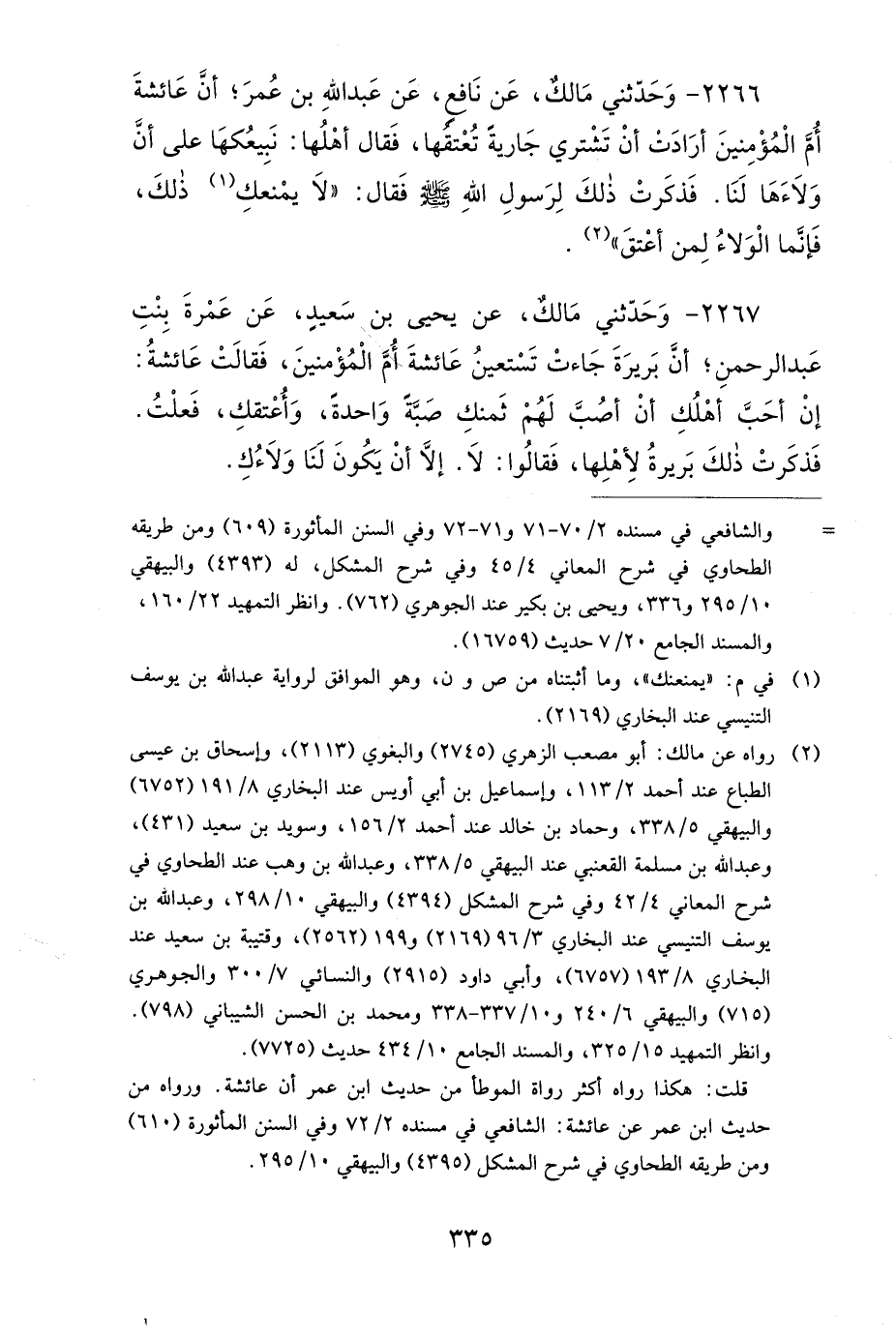 2266- وَحَدَّثَنِي مَالِكٌ (1)، عَنْ نَافِعٍ، عَنْ عَبْدِ اللهِ بْنِ عُمَرَ؛ أَنَّ عَائِشَةَ أُمَّ الْمُؤْمِنِينَ، أَرَادَتْ أَنْ تَشْتَرِيَ جَارِيَةً تُعْتِقُهَا، فَقَالَ أَهْلُهَا: نَبِيعُكِهَا عَلَى أَنَّ وَلاَءَهَا لَنَا، فَذَكَرَتْ ذَلِكَ لِرَسُولِ اللهِ صَلى الله عَلَيهِ وَسَلمَ فَقَالَ: لاَ يَمْنَعُكِ ذَلِكَ، فَإِنَّمَا الْوَلاَءُ لِمَنْ أَعْتَقَ.