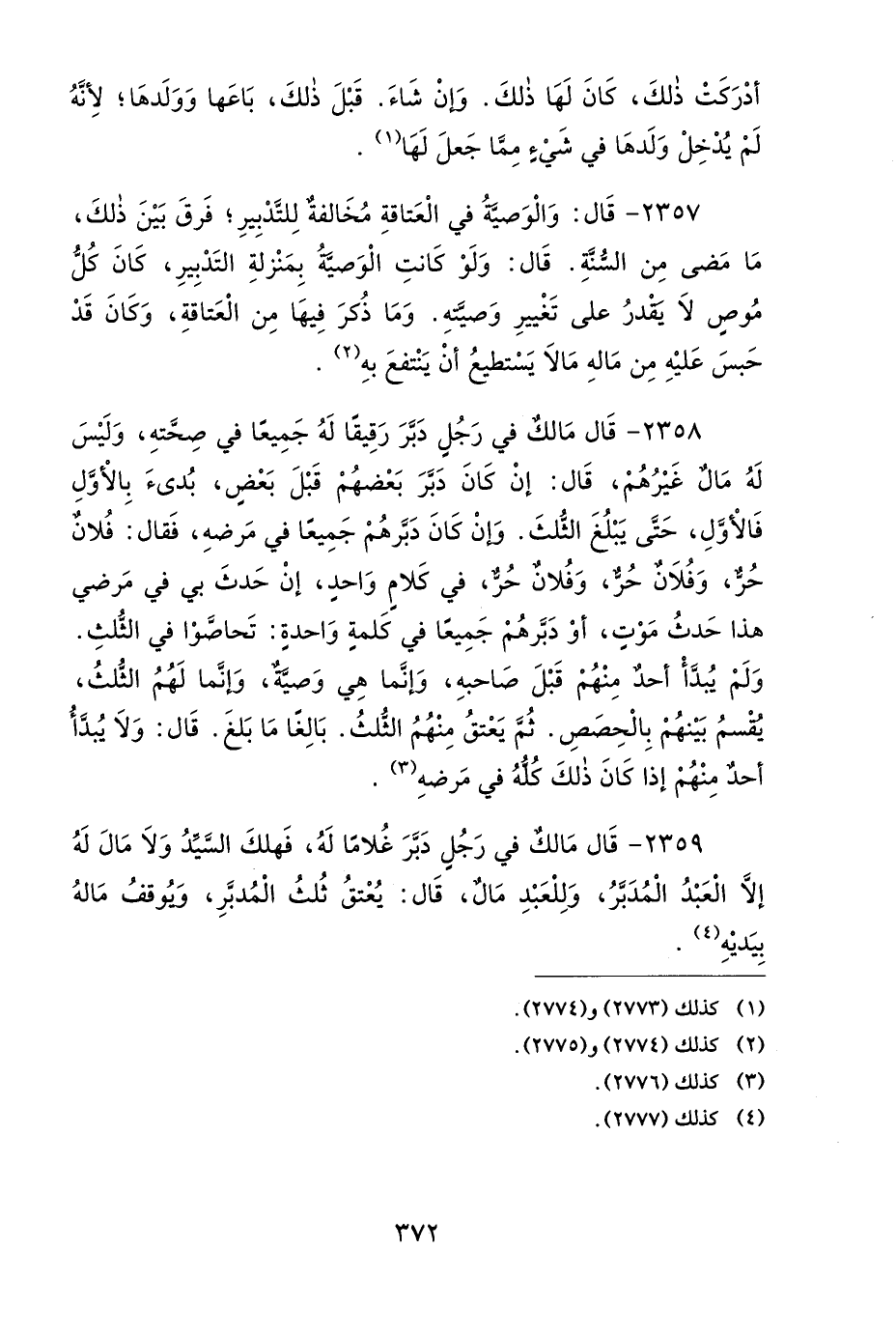 2357- قَالَ: وَالْوَصِيَّةُ فِي الْعَتَاقَةِ مُخَالِفَةٌ لِلتَّدْبِيرِ، فَرَقَ بَيْنَ ذَلِكَ مَا مَضَى مِنَ السُّنَّةِ، قَالَ: وَلَوْ كَانَتِ الْوَصِيَّةُ بِمَنْزِلَةِ التَّدْبِيرِ، كَانَ كُلُّ مُوصٍ لاَ يَقْدِرُ عَلَى تَغْيِيرِ وَصِيَّتِهِ، وَمَا ذُكِرَ فِيهَا مِنَ الْعَتَاقَةِ، وَكَانَ قَدْ حَبَسَ عَلَيْهِ مِنْ مَالِهِ مَا لاَ يَسْتَطِيعُ أَنْ يَنْتَفِعَ بِهِ.