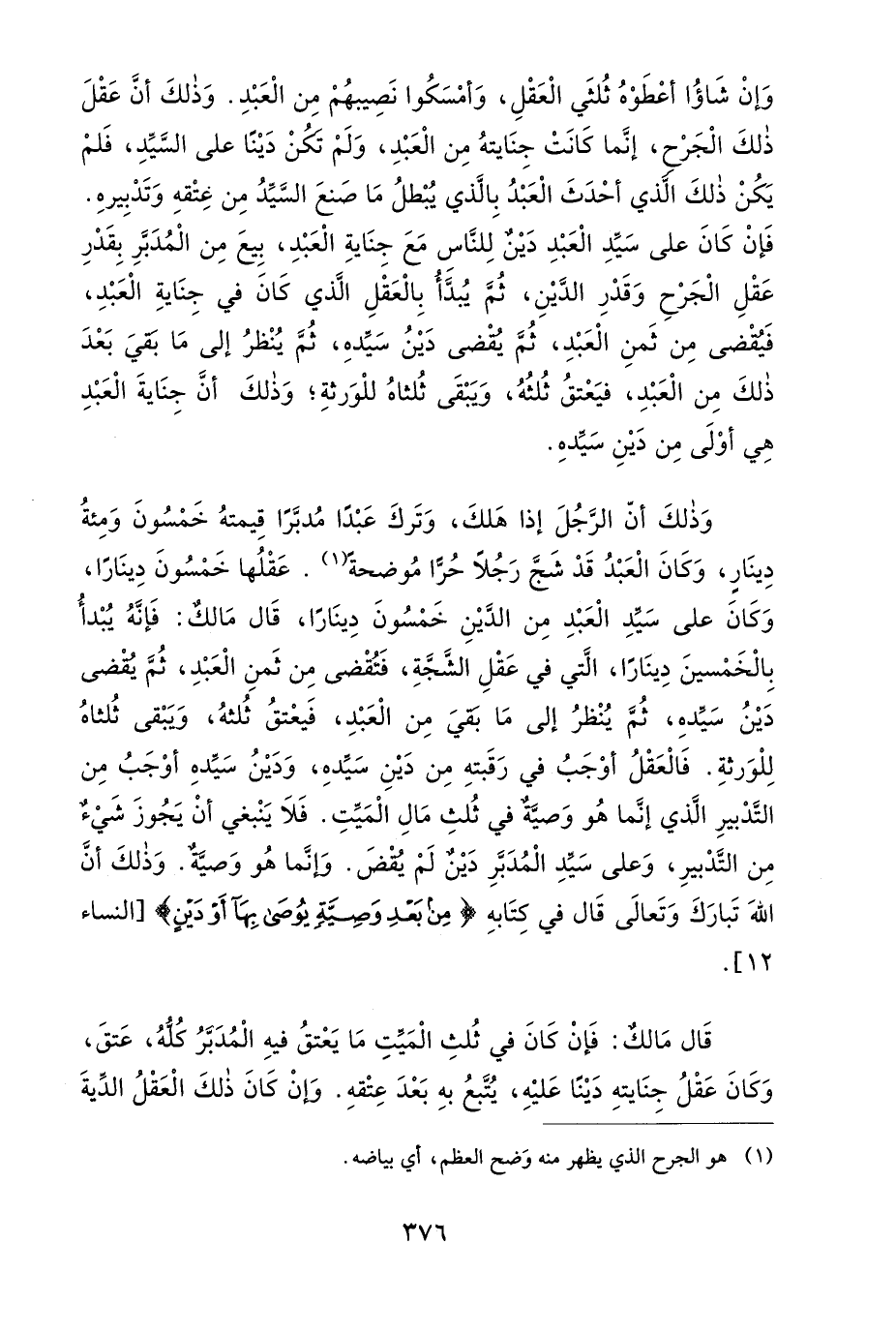 وَذَلِكَ أَنَّ الرَّجُلَ إِذَا هَلَكَ وَتَرَكَ عَبْدًا مُدَبَّرًا، قِيمَتُهُ خَمْسُونَ وَمِئَةُ دِينَارٍ، وَكَانَ الْعَبْدُ قَدْ شَجَّ رَجُلاً حُرًّا، مُوضِحَةً عَقْلُهَا خَمْسُونَ دِينَارًا، وَكَانَ عَلَى سَيِّدِ الْعَبْدِ مِنَ الدَّيْنِ خَمْسُونَ دِينَارًا، قَالَ مَالِكٌ: فَإِنَّهُ يُبْدَأُ بِالْخَمْسِينَ دِينَارًا الَّتِي فِي عَقْلِ الشَّجَّةِ، فَتُقْضَى مِنْ ثَمَنِ الْعَبْدِ، ثُمَّ يُقْضَى دَيْنُ سَيِّدِهِ، ثُمَّ يُنْظَرُ إِلَى مَا بَقِيَ مِنَ الْعَبْدِ، فَيَعْتِقُ ثُلُثُهُ، وَيَبْقَى ثُلُثَاهُ لِلْوَرَثَةِ، فَالْعَقْلُ أَوْجَبُ فِي رَقَبَتِهِ مِنْ دَيْنِ سَيِّدِهِ، وَدَيْنُ سَيِّدِهِ أَوْجَبُ مِنَ التَّدْبِيرِ، الَّذِي إِنَّمَا هُوَ وَصِيَّةٌ فِي ثُلُثِ مَالِ الْمَيِّتِ، فَلاَ يَنْبَغِي أَنْ يَجُوزَ شَيْءٌ مِنَ التَّدْبِيرِ، وَعَلَى سَيِّدِ الْمُدَبَّرِ دَيْنٌ لَمْ يُقْضَ، وَإِنَّمَا هُوَ وَصِيَّةٌ، وَذَلِكَ أَنَّ اللهَ تَبَارَكَ وَتَعَالَى قَالَ فِي كِتَابِهِ: {مِنْ بَعْدِ وَصِيَّةٍ يُوصَى بِهَا أَوْ دَيْنٍ}.