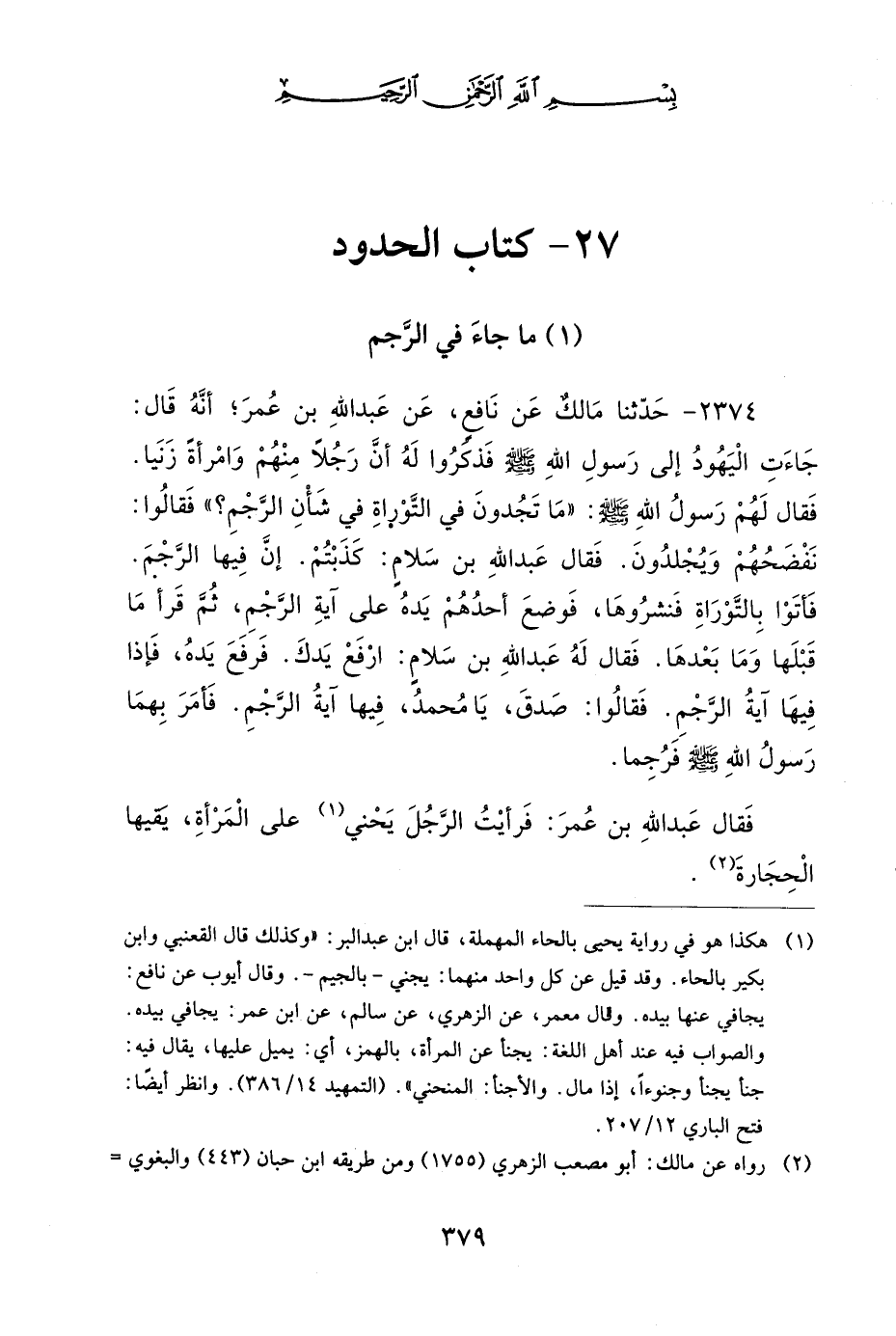 2374 - حَدَّثَنَا مَالِكٌ (1)، عَنْ نَافِعٍ، عَنْ عَبْدِ اللهِ بْنِ عُمَرَ؛ أَنَّهُ قَالَ: جَاءَتِ الْيَهُودُ إِلَى رَسُولِ اللهِ صَلى الله عَلَيهِ وَسَلمَ، فَذَكَرُوا لَهُ، أَنَّ رَجُلاً مِنْهُمْ وَامْرَأَةً زَنَيَا، فَقَالَ لَهُمْ رَسُولُ اللهِ صَلى الله عَلَيهِ وَسَلمَ: مَا تَجِدُونَ فِي التَّوْرَاةِ فِي شَأْنِ الرَّجْمِ؟ فَقَالُوا: نَفْضَحُهُمْ وَيُجْلَدُونَ، فَقَالَ عَبْدُ اللهِ بْنُ سَلاَمٍ: كَذَبْتُمْ، إِنَّ فِيهَا الرَّجْمَ، فَأَتَوْا بِالتَّوْرَاةِ فَنَشَرُوهَا، فَوَضَعَ أَحَدُهُمْ يَدَهُ عَلَى آيَةِ الرَّجْمِ، ثُمَّ قَرَأَ مَا قَبْلَهَا وَمَا بَعْدَهَا، فَقَالَ لَهُ عَبْدُ اللهِ بْنُ سَلاَمٍ: ارْفَعْ يَدَكَ، فَرَفَعَ يَدَهُ، فَإِذَا فِيهَا آيَةُ الرَّجْمِ، فَقَالُوا: صَدَقَ يَا مُحَمَّدُ، فِيهَا آيَةُ الرَّجْمِ، فَأَمَرَ بِهِمَا رَسُولُ اللهِ صَلى الله عَلَيهِ وَسَلمَ فَرُجِمَا.