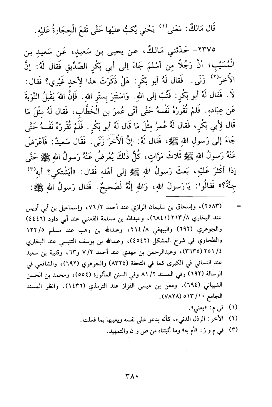 2375- حَدَّثَنِي مَالِكٌ، عَنْ يَحْيَى بْنِ سَعِيدٍ، عَنْ سَعِيدِ بْنِ الْمُسَيَّبِ، أَنَّ رَجُلاً مِنْ أَسْلَمَ جَاءَ إِلَى أَبِي بَكْرٍ الصِّدِّيقِ، فَقَالَ لَهُ: إِنَّ الآخِرَ زَنَى، فَقَالَ لَهُ أَبُو بَكْرٍ: هَلْ ذَكَرْتَ هَذَا لأَحَدٍ غَيْرِي؟ فَقَالَ: لاَ، فَقَالَ لَهُ أَبُو بَكْرٍ: فَتُبْ إِلَى اللهِ، وَاسْتَتِرْ بِسِتْرِ اللهِ، فَإِنَّ اللهَ يَقْبَلُ التَّوْبَةَ عَنْ عِبَادِهِ، فَلَمْ تُقْرِرْهُ نَفْسُهُ، حَتَّى أَتَى عُمَرَ بْنَ الْخَطَّابِ، فَقَالَ لَهُ مِثْلَ مَا قَالَ لأَبِي بَكْرٍ، فَقَالَ لَهُ عُمَرُ، مِثْلَ مَا قَالَ لَهُ أَبُو بَكْرٍ، فَلَمْ تُقْرِرْهُ نَفْسُهُ، حَتَّى جَاءَ إِلَى رَسُولِ اللهِ صَلى الله عَلَيهِ وَسَلمَ، فَقَالَ لَهُ: إِنَّ الأَخِرَ زَنَى، فَقَالَ سَعِيدٌ: فَأَعْرَضَ عَنْهُ رَسُولُ اللهِ صَلى الله عَلَيهِ وَسَلمَ ثَلاَثَ مَرَّاتٍ، كُلُّ ذَلِكَ يُعْرِضُ عَنْهُ رَسُولُ اللهِ صَلى الله عَلَيهِ وَسَلمَ، حَتَّى إِذَا أَكْثَرَ عَلَيْهِ، بَعَثَ رَسُولُ اللهِ صَلى الله عَلَيهِ وَسَلمَ إِلَى أَهْلِهِ، فَقَالَ: أَيَشْتَكِي؟ أَبِهِ جِنَّةٌ؟ فَقَالُوا: يَا رَسُولَ اللهِ، وَاللَّهِ إِنَّهُ لَصَحِيحٌ، فَقَالَ رَسُولُ اللهِ صَلى الله عَلَيهِ وَسَلمَ: أَبِكْرٌ أَمْ ثَيِّبٌ؟ فَقَالُوا: بَلْ ثَيِّبٌ يَا رَسُولَ اللهِ، فَأَمَرَ بِهِ رَسُولُ اللهِ صَلى الله عَلَيهِ وَسَلمَ، فَرُجِمَ.