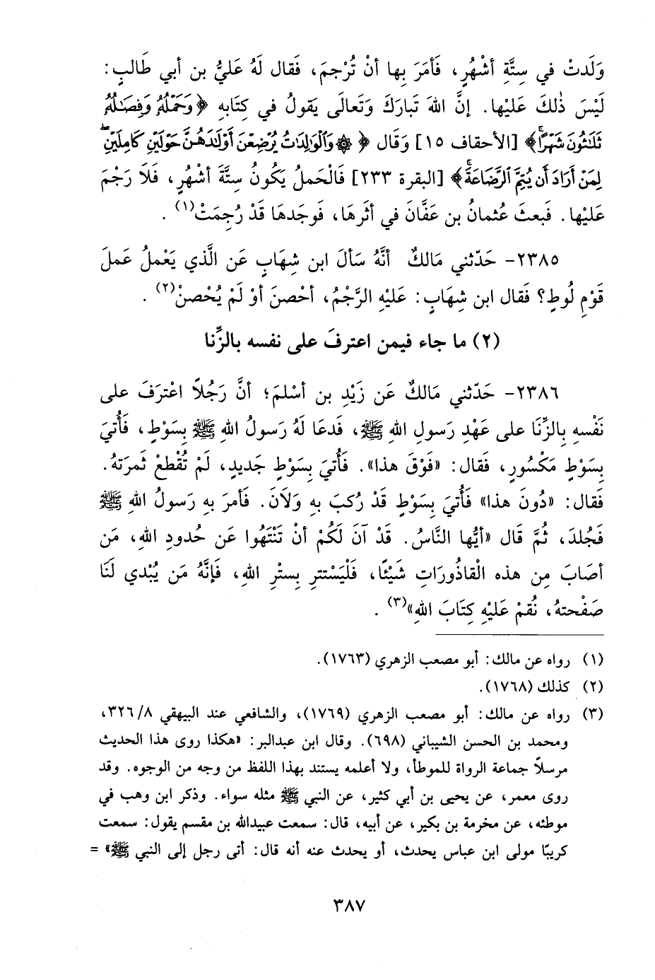 2386 - حَدَّثَنِي مَالِكٌ، عَنْ زَيْدِ بْنِ أَسْلَمَ، أَنَّ رَجُلاً اعْتَرَفَ عَلَى نَفْسِهِ بِالزِّنَا، عَلَى عَهْدِ رَسُولِ اللهِ صَلى الله عَلَيهِ وَسَلمَ، فَدَعَا لَهُ رَسُولُ اللهِ صَلى الله عَلَيهِ وَسَلمَ بِسَوْطٍ، فَأُتِيَ بِسَوْطٍ مَكْسُورٍ، فَقَالَ: فَوْقَ هَذَا، فَأُتِيَ بِسَوْطٍ جَدِيدٍ لَمْ تُقْطَعْ ثَمَرَتُهُ، فَقَالَ: دُونَ هَذَا، فَأُتِيَ بِسَوْطٍ قَدْ رُكِبَ بِهِ وَلاَنَ، فَأَمَرَ بِهِ رَسُولُ اللهِ صَلى الله عَلَيهِ وَسَلمَ فَجُلِدَ، ثُمَّ قَالَ: أَيُّهَا النَّاسُ، قَدْ آنَ لَكُمْ أَنْ تَنْتَهُوا عَنْ حُدُودِ اللهِ، مَنْ أَصَابَ مِنْ هَذِهِ الْقَاذُورَاتِ شَيْئًا، فَلْيَسْتَتِرْ بِسِتْرِ اللهِ، فَإِنَّهُ مَنْ يُبْدِي لَنَا صَفْحَتَهُ، نُقِمْ عَلَيْهِ كِتَابَ اللهِ.