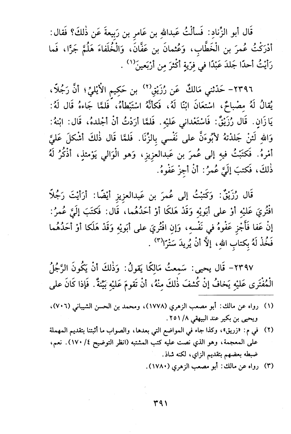 2396 - حَدَّثَنِي مَالِكٌ، عَنْ رُزَيْقِ بْنِ حَكِيمٍ الأَيْلِيِّ، أَنَّ رَجُلاً يُقَالُ لَهُ: مِصْبَاحٌ، اسْتَعَانَ ابْنًا لَهُ، فَكَأَنَّهُ اسْتَبْطَأَهُ، فَلَمَّا جَاءَهُ قَالَ لَهُ: يَا زَانٍ، قَالَ رُزَيْقٌ: فَاسْتَعْدَانِي عَلَيْهِ، فَلَمَّا أَرَدْتُ أَنْ أَجْلِدَهُ، قَالَ ابْنُهُ: وَاللَّهِ لَئِنْ جَلَدْتَهُ لأَبُوءَنَّ عَلَى نَفْسِي بِالزِّنَا، فَلَمَّا قَالَ ذَلِكَ: أَشْكَلَ عَلَيَّ أَمْرُهُ، فَكَتَبْتُ فِيهِ إِلَى عُمَرَ بْنِ عَبْدِ الْعَزِيزِ، وَهُوَ الْوَالِي يَوْمَئِذٍ، أَذْكُرُ لَهُ ذَلِكَ، فَكَتَبَ إِلَيَّ عُمَرُ، أَنْ أَجِزْ عَفْوَهُ.
