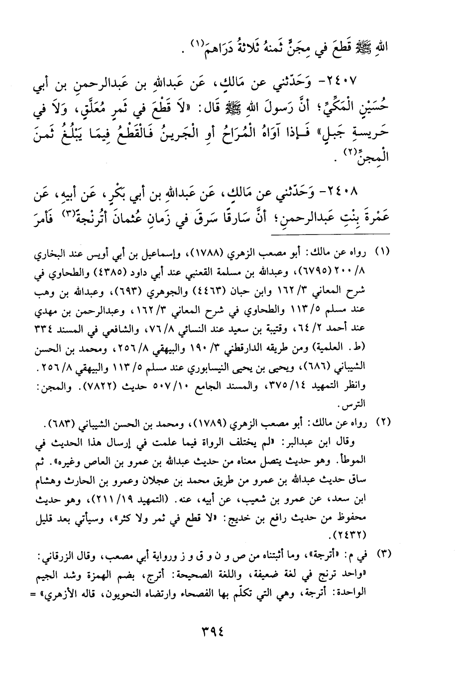 2407- وَحَدَّثَنِي عَنْ مَالِكٍ، عَنْ عَبْدِ اللهِ بْنِ عَبْدِ الرَّحْمَنِ بْنِ أَبِي حُسَيْنٍ الْمَكِّيِّ، أَنَّ رَسُولَ اللهِ صَلى الله عَلَيهِ وَسَلمَ قَالَ: لاَ قَطْعَ فِي ثَمَرٍ مُعَلَّقٍ، وَلاَ فِي حَرِيسَةِ جَبَلٍ، فَإِذَا آوَاهُ الْمُرَاحُ أَوِ الْجَرِينُ، فَالْقَطْعُ فِيمَا يَبْلُغُ ثَمَنَ الْمِجَنِّ.