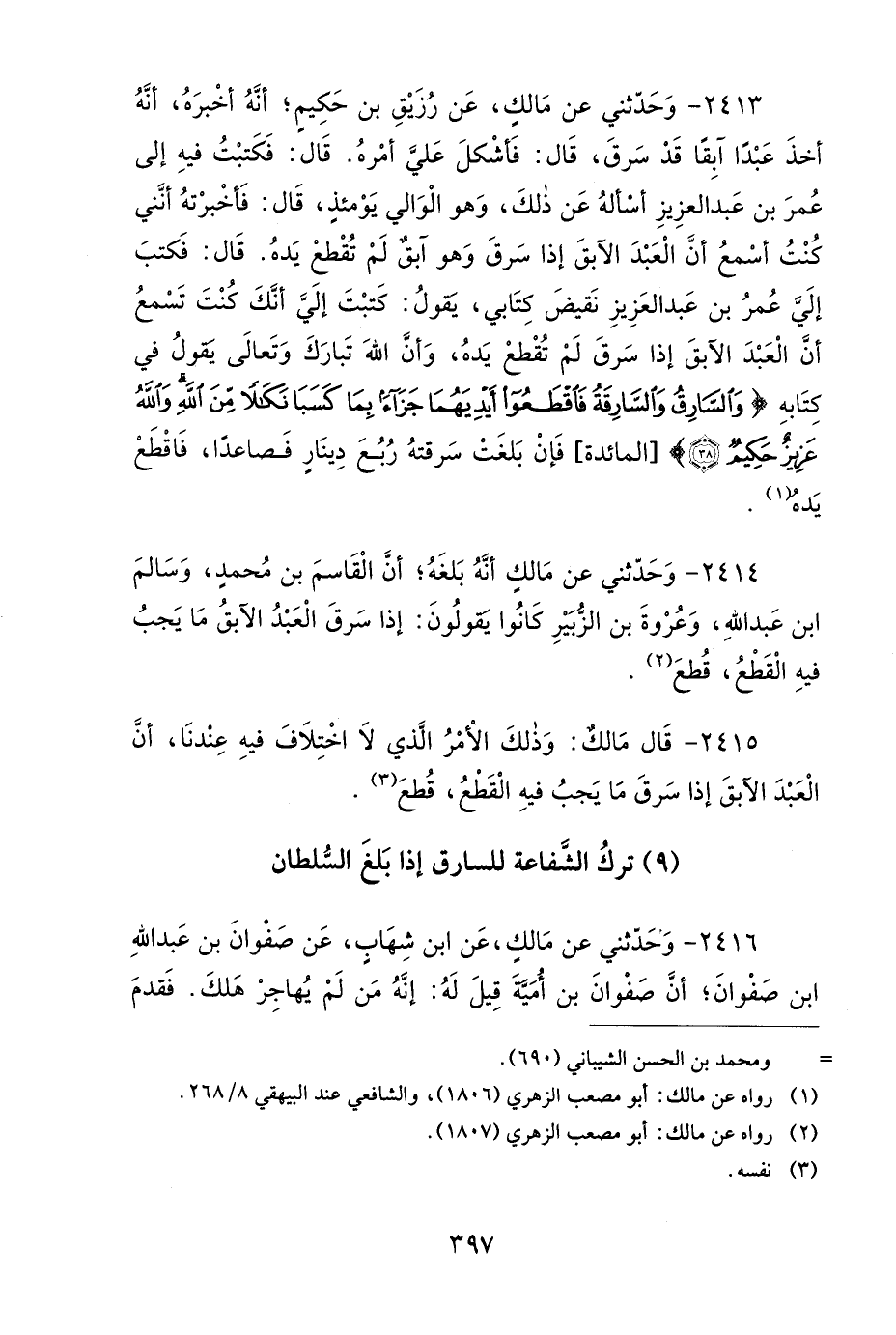 2413 - وَحَدَّثَنِي عَنْ مَالِكٍ، عَنْ رُزَيْقِ بْنِ حَكِيمٍ، أَنَّهُ أَخْبَرَهُ، أَنَّهُ أَخَذَ عَبْدًا آبِقًا، قَدْ سَرَقَ، قَالَ: فَأَشْكَلَ عَلَيَّ أَمْرُهُ، قَالَ: فَكَتَبْتُ فِيهِ إِلَى عُمَرَ بْنِ عَبْدِ الْعَزِيزِ، أَسْأَلُهُ عَنْ ذَلِكَ، وَهُوَ الْوَالِي يَوْمَئِذٍ، قَالَ: فَأَخْبَرْتُهُ أَنَّنِي كُنْتُ أَسْمَعُ أَنَّ الْعَبْدَ الآبِقَ إِذَا سَرَقَ وَهُوَ آبِقٌ، لَمْ تُقْطَعْ يَدُهُ، قَالَ: فَكَتَبَ إِلَيَّ عُمَرُ بْنُ عَبْدِ الْعَزِيزِ نَقِيضَ كِتَابِي يَقُولُ: كَتَبْتَ إِلَيَّ: أَنَّكَ كُنْتَ تَسْمَعُ أَنَّ الْعَبْدَ الآبِقَ إِذَا سَرَقَ لَمْ تُقْطَعْ يَدُهُ، وَإِنَّ اللهَ تَبَارَكَ وَتَعَالَى يَقُولُ فِي كِتَابِهِ: {وَالسَّارِقُ وَالسَّارِقَةُ فَاقْطَعُوا أَيْدِيَهُمَا جَزَاءً بِمَا كَسَبَا نَكَالاً مِنَ اللهِ وَاللهُ عَزِيزٌ حَكِيمٌ} فَإِنْ بَلَغَتْ سَرِقَتُهُ رُبُعَ دِينَارٍ فَصَاعِدًا، فَاقْطَعْ يَدَهُ.