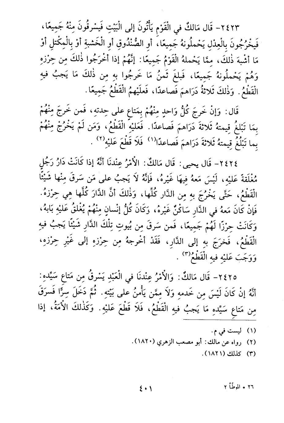 2424- قَالَ يَحْيَى: قَالَ مَالِكٌ: الأَمْرُ عِنْدَنَا أَنَّهُ إِذَا كَانَتْ دَارُ رَجُلٍ مُغْلَقَةً عَلَيْهِ، لَيْسَ مَعَهُ فِيهَا غَيْرُهُ، فَإِنَّهُ لاَ يَجِبُ عَلَى مَنْ سَرَقَ مِنْهَا شَيْئًا الْقَطْعُ، حَتَّى يَخْرُجَ بِهِ مِنَ الدَّارِ كُلِّهَا، وَذَلِكَ أَنَّ الدَّارَ كُلَّهَا هِيَ حِرْزُهُ، فَإِنْ كَانَ مَعَهُ فِي الدَّارِ سَاكِنٌ غَيْرُهُ وَكَانَ كُلُّ إِنْسَانٍ مِنْهُمْ يُغْلِقُ عَلَيْهِ بَابَهُ وَكَانَتْ حِرْزًا لَهُمْ جَمِيعًا، فَمَنْ سَرَقَ مِنْ بُيُوتِ تِلْكَ الدَّارِ شَيْئًا يَجِبُ فِيهِ الْقَطْعُ، فَخَرَجَ بِهِ إِلَى الدَّارِ، فَقَدْ أَخْرَجَهُ مِنْ حِرْزِهِ إِلَى غَيْرِ حِرْزِهِ، وَوَجَبَ عَلَيْهِ فِيهِ الْقَطْعُ.