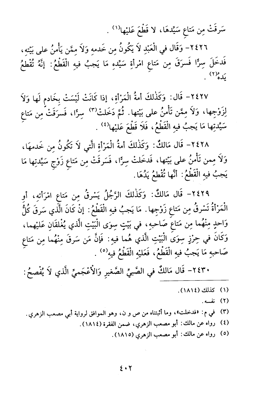 2426- وَقَالَ فِي الْعَبْدِ لاَ يَكُونُ مِنْ خَدَمِهِ، وَلاَ مِمَّنْ يَأْمَنُ عَلَى بَيْتِهِ، فَدَخَلَ سِرًّا، فَسَرَقَ مِنْ مَتَاعِ امْرَأَةِ سَيِّدِهِ مَا يَجِبُ فِيهِ الْقَطْعُ: إِنَّهُ تُقْطَعُ يَدُهُ.