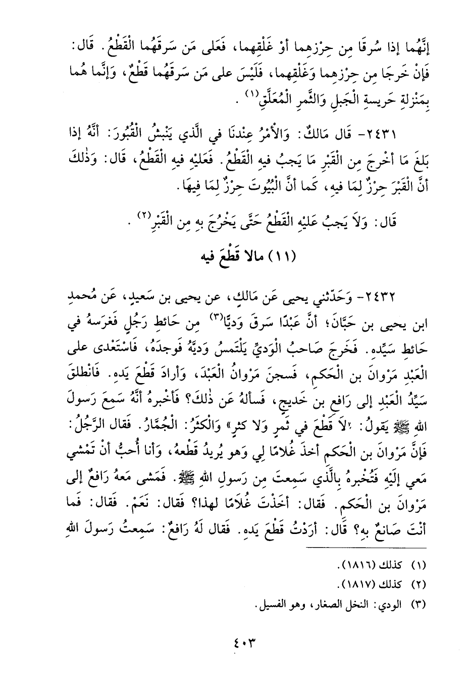 2432- وحَدَّثَنِي يَحْيَى عَنْ مَالِكٍ، وَحَدَّثَنِي يَحْيَى بْنِ سَعِيدٍ، عَنْ مُحَمَّدِ بْنِ يَحْيَى بْنِ حَبَّانَ، أَنَّ عَبْدًا سَرَقَ وَدِيًّا مِنْ حَائِطِ رَجُلٍ، فَغَرَسَهُ فِي حَائِطِ سَيِّدِهِ، فَخَرَجَ صَاحِبُ الْوَدِيِّ يَلْتَمِسُ وَدِيَّهُ، فَوَجَدَهُ، فَاسْتَعْدَى عَلَى الْعَبْدِ مَرْوَانَ بْنَ الْحَكَمِ، فَسَجَنَ مَرْوَانُ الْعَبْدَ وَأَرَادَ قَطْعَ يَدِهِ، فَانْطَلَقَ سَيِّدُ الْعَبْدِ إِلَى رَافِعِ بْنِ خَدِيجٍ فَسَأَلَهُ عَنْ ذَلِكَ، فَأَخْبَرَهُ، أَنَّهُ سَمِعَ رَسُولَ اللهِ صَلى الله عَلَيهِ وَسَلمَ يَقُولُ: لاَ قَطْعَ فِي ثَمَرٍ، وَلاَ كَثَرٍ، وَالْكَثَرُ: الْجُمَّارُ، فَقَالَ الرَّجُلُ: فَإِنَّ مَرْوَانَ بْنَ الْحَكَمِ، أَخَذَ غُلاَمًا لِي، وَهُوَ يُرِيدُ قَطْعَهُ، وَأَنَا أُحِبُّ أَنْ تَمْشِيَ مَعِيَ إِلَيْهِ، فَتُخْبِرَهُ بِالَّذِي سَمِعْتَ مِنْ رَسُولِ اللهِ صَلى الله عَلَيهِ وَسَلمَ، فَمَشَى مَعَهُ رَافِعٌ إِلَى مَرْوَانَ بْنِ الْحَكَمِ، فَقَالَ: أَخَذْتَ غُلاَمًا لِهَذَا؟ فَقَالَ: نَعَمْ، فَقَالَ: فَمَا أَنْتَ صَانِعٌ بِهِ، قَالَ: أَرَدْتُ قَطْعَ يَدِهِ، فَقَالَ لَهُ رَافِعٌ: سَمِعْتُ رَسُولَ اللهِ صَلى الله عَلَيهِ وَسَلمَ يَقُولُ: لاَ قَطْعَ فِي ثَمَرٍ وَلاَ كَثَرٍ، فَأَمَرَ مَرْوَانُ بِالْعَبْدِ فَأُرْسِلَ.