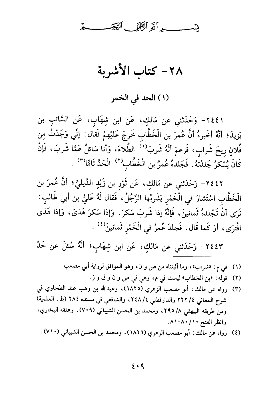 2443- وَحَدَّثَنِي عَنْ مَالِكٍ، عَنِ ابْنِ شِهَابٍ، أَنَّهُ سُئِلَ عَنْ حَدِّ الْعَبْدِ فِي الْخَمْرِ؟ فَقَالَ: بَلَغَنِي أَنَّ عَلَيْهِ نِصْفَ حَدِّ الْحُرِّ فِي الْخَمْرِ، وَأَنَّ عُمَرَ بْنَ الْخَطَّابِ، وَعُثْمَانَ بْنَ عَفَّانَ، وَعَبْدَ اللهِ بْنَ عُمَرَ، قَدْ جَلَدُوا عَبِيدَهُمْ نِصْفَ حَدِّ الْحُرِّ فِي الْخَمْرِ.