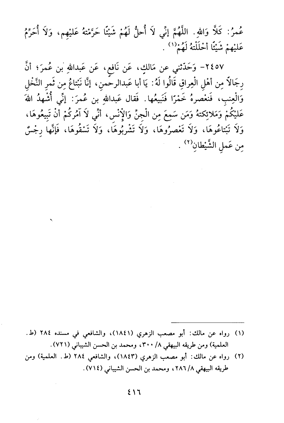 2457- وَحَدَّثَنِي عَنْ مَالِكٍ، عَنْ نَافِعٍ، عَنْ عَبْدِ اللهِ بْنِ عُمَرَ؛ أَنَّ رِجَالاً مِنْ أَهْلِ الْعِرَاقِ قَالُوا لَهُ: يَا أَبَا عَبْدِ الرَّحْمَنِ، إِنَّا نَبْتَاعُ مِنْ ثَمَرِ النَّخْلِ وَالْعِنَبِ، فَنَعْصِرُهُ خَمْرًا، فَنَبِيعُهَا، فَقَالَ عَبْدُ اللهِ بْنُ عُمَرَ: إِنِّي أُشْهِدُ اللهَ عَلَيْكُمْ وَمَلاَئِكَتَهُ وَمَنْ سَمِعَ مِنَ الْجِنِّ وَالإِنْسِ، أَنِّي لاَ آمُرُكُمْ أَنْ تَبِيعُوهَا، وَلاَ تَبْتَاعُوهَا، وَلاَ تَعْصِرُوهَا وَلاَ تَشْرَبُوهَا، وَلاَ تَسْقُوهَا، فَإِنَّهَا رِجْسٌ مِنْ عَمَلِ الشَّيْطَانِ.