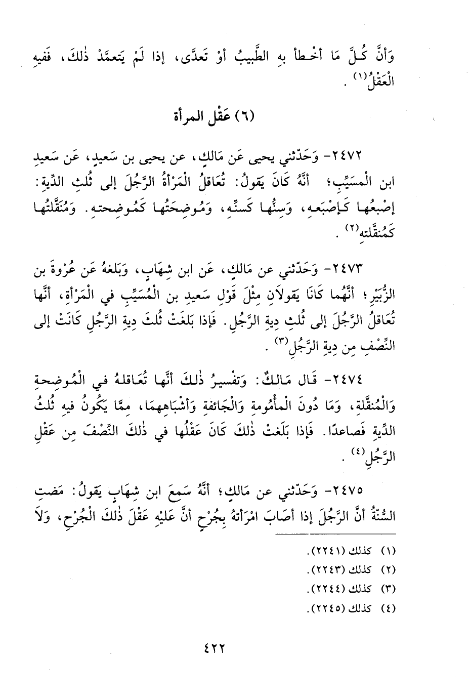 2473- وحَدَّثَنِي عَنْ مَالِكٍ، عَنِ ابْنِ شِهَابٍ، وَبَلَغَهُ عَنْ عُرْوَةَ بْنِ الزُّبَيْرِ، أَنَّهُمَا كَانَا يَقُولاَنِ مِثْلَ قَوْلِ سَعِيدِ بْنِ الْمُسَيَّبِ فِي الْمَرْأَةِ: أَنَّهَا تُعَاقِلُ الرَّجُلَ إِلَى ثُلُثِ دِيَةِ الرَّجُلِ، فَإِذَا بَلَغَتْ ثُلُثَ دِيَةِ الرَّجُلِ، كَانَتْ إِلَى النِّصْفِ مِنْ دِيَةِ الرَّجُلِ.