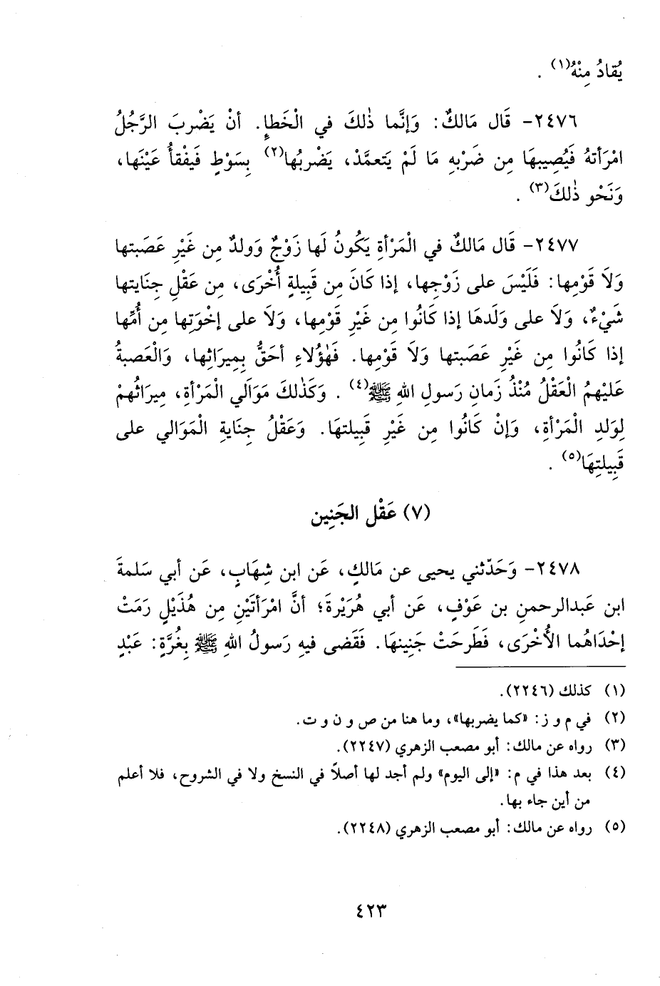 2478- وَحَدَّثَنِي يَحْيَى، عَنْ مَالِكٍ، عَنِ ابْنِ شِهَابٍ، عَنْ أَبِي سَلَمَةَ بْنِ عَبْدِ الرَّحْمَنِ بْنِ عَوْفٍ، عَنْ أَبِي هُرَيْرَةَ، أَنَّ امْرَأَتَيْنِ مِنْ هُذَيْلٍ، رَمَتْ إِحْدَاهُمَا الأَخْرَى، فَطَرَحَتْ جَنِينَهَا، فَقَضَى فِيهِ رَسُولُ اللهِ صَلى الله عَلَيهِ وَسَلمَ بِغُرَّةٍ عَبْدٍ أَوْ وَلِيدَةٍ.