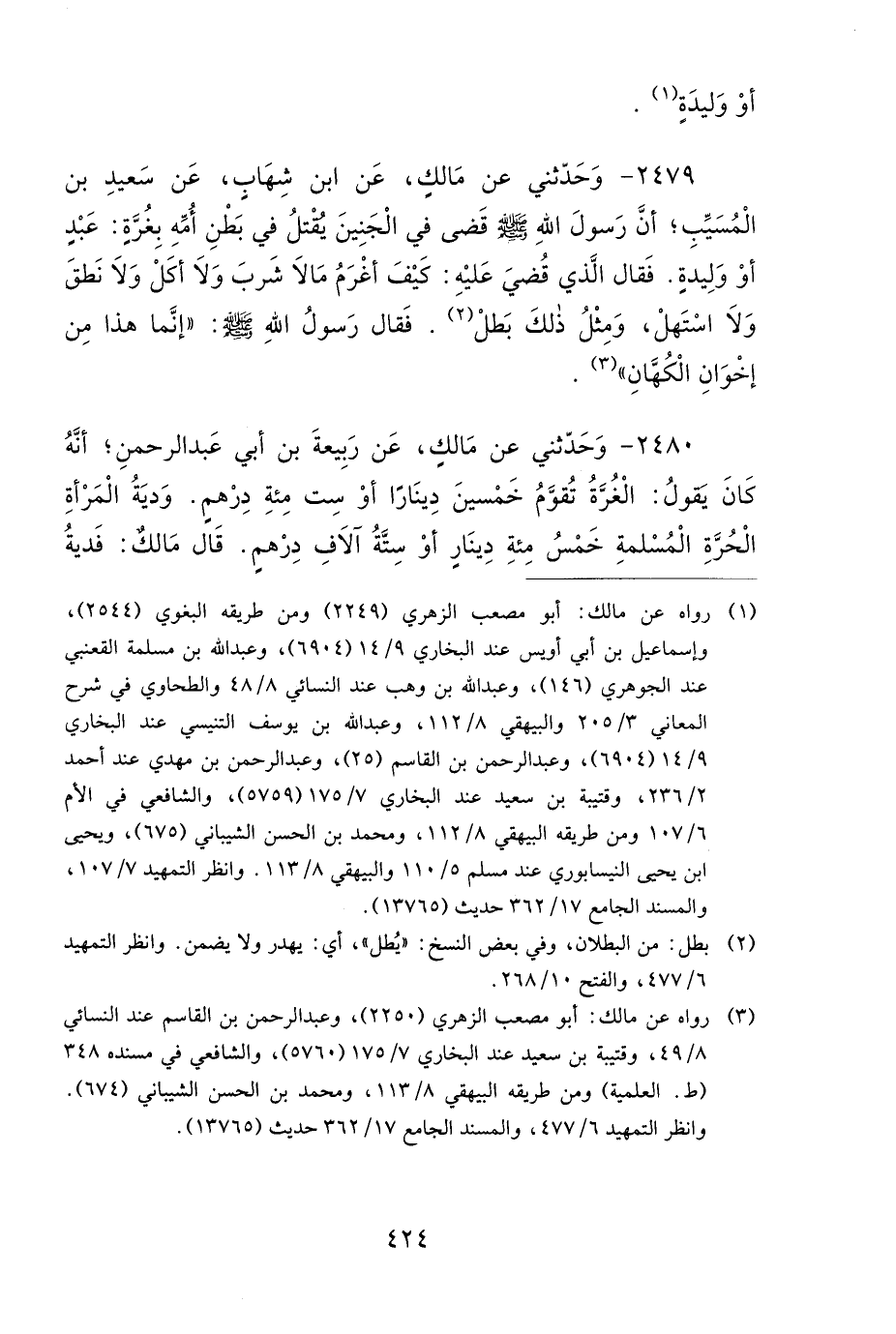2479- وَحَدَّثَنِي عَنْ مَالِكٍ، عَنِ ابْنِ شِهَابٍ، عَنْ سَعِيدِ بْنِ الْمُسَيَّبِ، أَنَّ رَسُولَ اللهِ صَلى الله عَلَيهِ وَسَلمَ قَضَى فِي الْجَنِينِ يُقْتَلُ فِي بَطْنِ أُمِّهِ، بِغُرَّةٍ عَبْدٍ أَوْ وَلِيدَةٍ، فَقَالَ الَّذِي قُضِيَ عَلَيْهِ: كَيْفَ أَغْرَمُ مَا لاَ شَرِبَ، وَلاَ أَكَلْ، وَلاَ نَطَقَ، وَلاَ اسْتَهَلْ، وَمِثْلُ ذَلِكَ بَطَلْ، فَقَالَ رَسُولُ اللهِ صَلى الله عَلَيهِ وَسَلمَ: إِنَّمَا هَذَا مِنْ إِخْوَانِ الْكُهَّانِ.