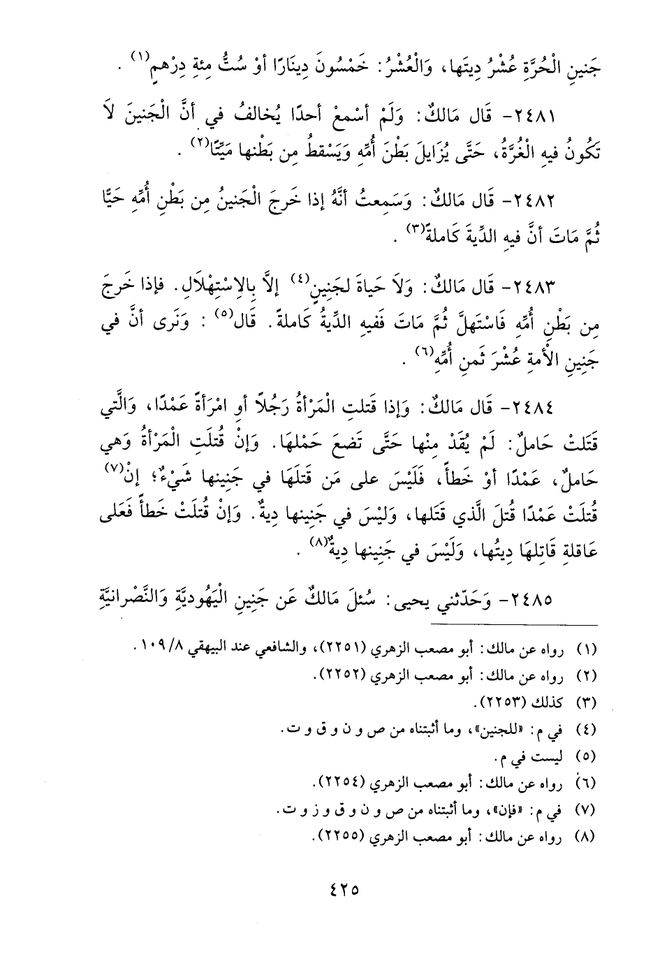2483- قَالَ مَالِكٌ: وَلاَ حَيَاةَ لِلْجَنِينِ إِلاَّ بِالاسْتِهْلاَلِ، فَإِذَا خَرَجَ مِنْ بَطْنِ أُمِّهِ فَاسْتَهَلَّ، ثُمَّ مَاتَ، فَفِيهِ الدِّيَةُ كَامِلَةً، قَالَ: وَنَرَى أَنَّ فِي جَنِينِ الأَمَةِ عُشْرَ ثَمَنِ أُمِّهِ.