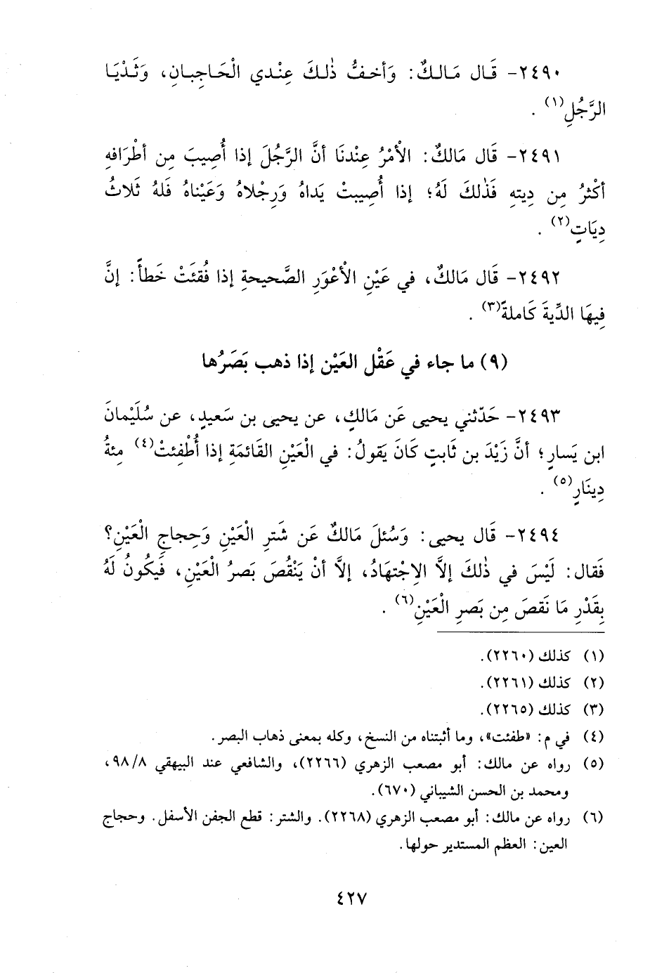2493- حَدَّثَنِي يَحْيَى، عَنْ مَالِكٍ، عَنْ يَحْيَى بْنِ سَعِيدٍ، عَنْ سُلَيْمَانَ بْنِ يَسَارٍ، أَنَّ زَيْدَ بْنَ ثَابِتٍ كَانَ يَقُولُ: فِي الْعَيْنِ الْقَائِمَةِ إِذَا أُطْفِئَتْ مِئَةُ دِينَارٍ.