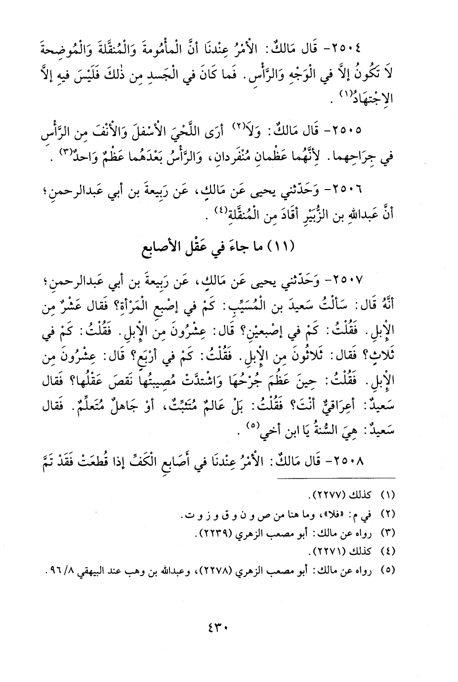 2507- وَحَدَّثَنِي يَحْيَى، عَنْ مَالِكٍ، عَنْ رَبِيعَةَ بْنِ أَبِي عَبْدِ الرَّحْمَنِ، أَنَّهُ قَالَ: سَأَلْتُ سَعِيدَ بْنَ الْمُسَيَّبِ: كَمْ فِي إِصْبَعِ الْمَرْأَةِ؟ فَقَالَ: عَشْرٌ مِنَ الإِبِلِ، فَقُلْتُ: كَمْ فِي إِصْبَعَيْنِ؟ قَالَ: عِشْرُونَ مِنَ الإِبِلِ، فَقُلْتُ: كَمْ فِي ثَلاَثٍ؟ فَقَالَ: ثَلاَثُونَ مِنَ الإِبِلِ، فَقُلْتُ: كَمْ فِي أَرْبَعٍ؟ قَالَ: عِشْرُونَ مِنَ الإِبِلِ، فَقُلْتُ: حِينَ عَظُمَ جُرْحُهَا، وَاشْتَدَّتْ مُصِيبَتُهَا، نَقَصَ عَقْلُهَا؟ فَقَالَ سَعِيدٌ: أَعِرَاقِيٌّ أَنْتَ؟ فَقُلْتُ: بَلْ عَالِمٌ مُتَثَبِّتٌ، أَوْ جَاهِلٌ مُتَعَلِّمٌ، فَقَالَ سَعِيدٌ: هِيَ السُّنَّةُ يَا ابْنَ أَخِي.
