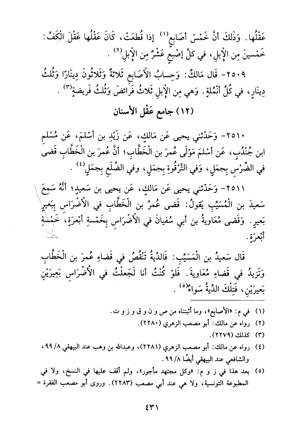 2511- وَحَدَّثَنِي يَحْيَى، عَنْ مَالِكٍ، عَنْ يَحْيَى بْنِ سَعِيدٍ، أَنَّهُ سَمِعَ سَعِيدَ بْنَ الْمُسَيَّبِ يَقُولُ: قَضَى عُمَرُ بْنُ الْخَطَّابِ فِي الأَضْرَاسِ بِبَعِيرٍ بَعِيرٍ، وَقَضَى مُعَاوِيَةُ بْنُ أَبِي سُفْيَانَ فِي الأَضْرَاسِ بِخَمْسَةِ أَبْعِرَةٍ خَمْسَةِ أَبْعِرَةٍ.