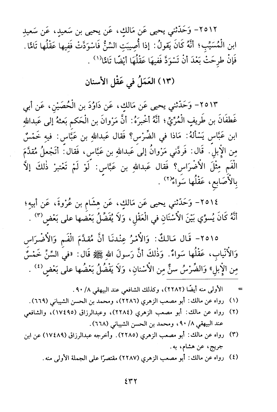 2514- وَحَدَّثَنِي يَحْيَى، عَنْ مَالِكٍ، عَنْ هِشَامِ بْنِ عُرْوَةَ، عَنْ أَبِيهِ، أَنَّهُ كَانَ يُسَوِّي بَيْنَ الأَسْنَانِ فِي الْعَقْلِ، وَلاَ يُفَضِّلُ بَعْضَهَا عَلَى بَعْضٍ.