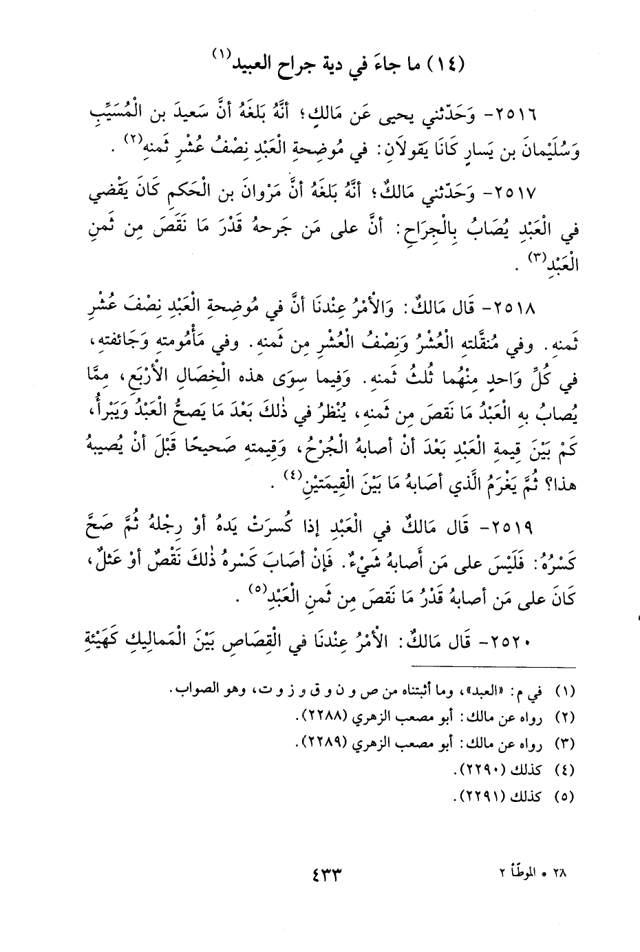 2517- وحَدَّثَنِي مَالِكٌ، أَنَّهُ بَلَغَهُ، أَنَّ مَرْوَانَ بْنَ الْحَكَمِ كَانَ يَقْضِي فِي الْعَبْدِ يُصَابُ بِالْجِرَاحِ، أَنَّ عَلَى مَنْ جَرَحَهُ قَدْرَ مَا نَقَصَ مِنْ ثَمَنِ الْعَبْدِ.